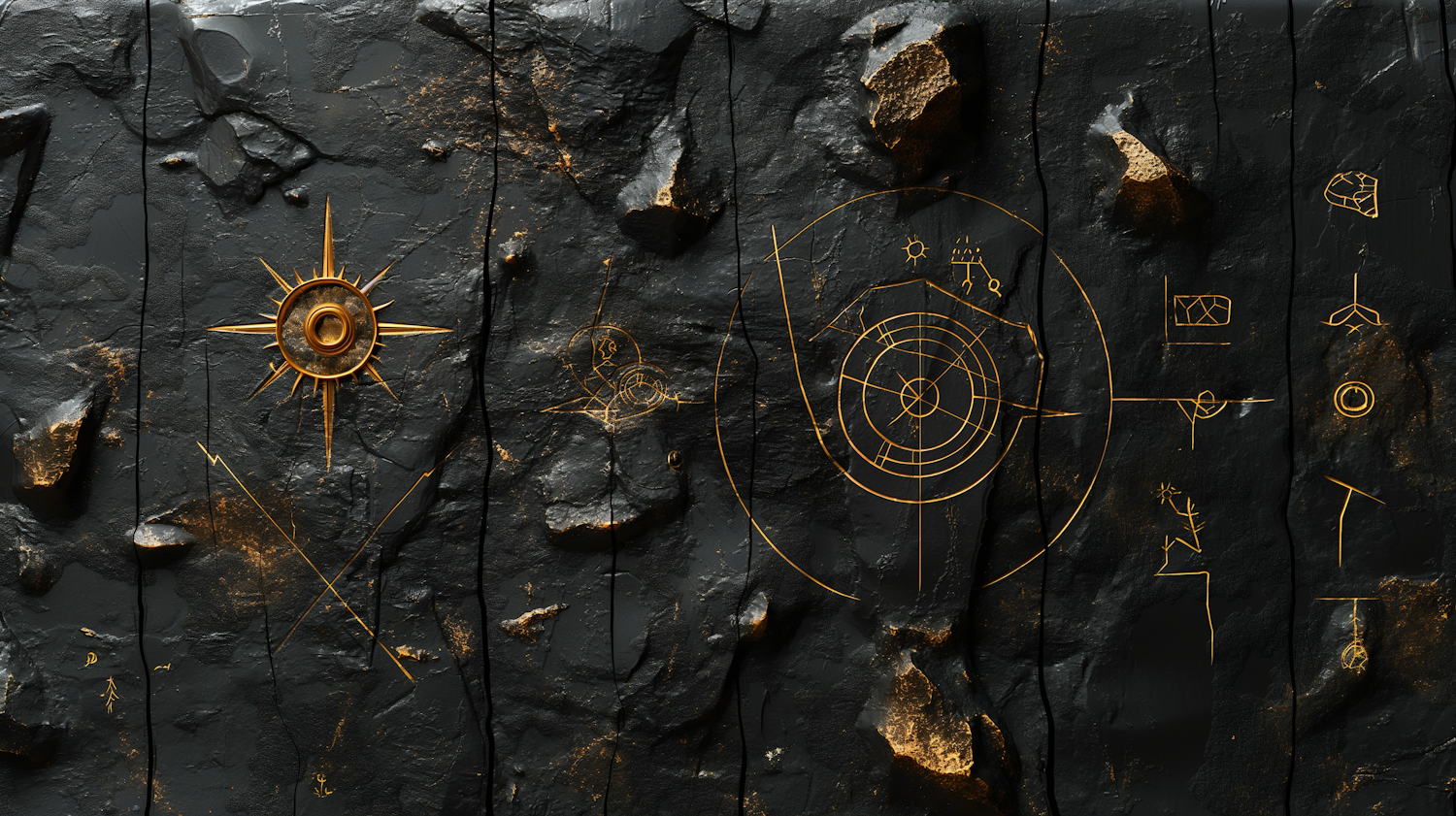 Intricate golden symbols on a textured black stone surface, featuring celestial and geometric designs with a mystical, ancient feel.