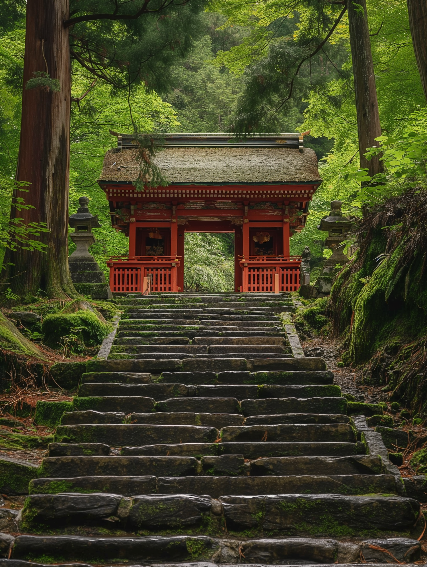 Moss-covered stone steps lead to a vibrant red torii gate in a lush green forest, creating a serene and spiritual atmosphere.