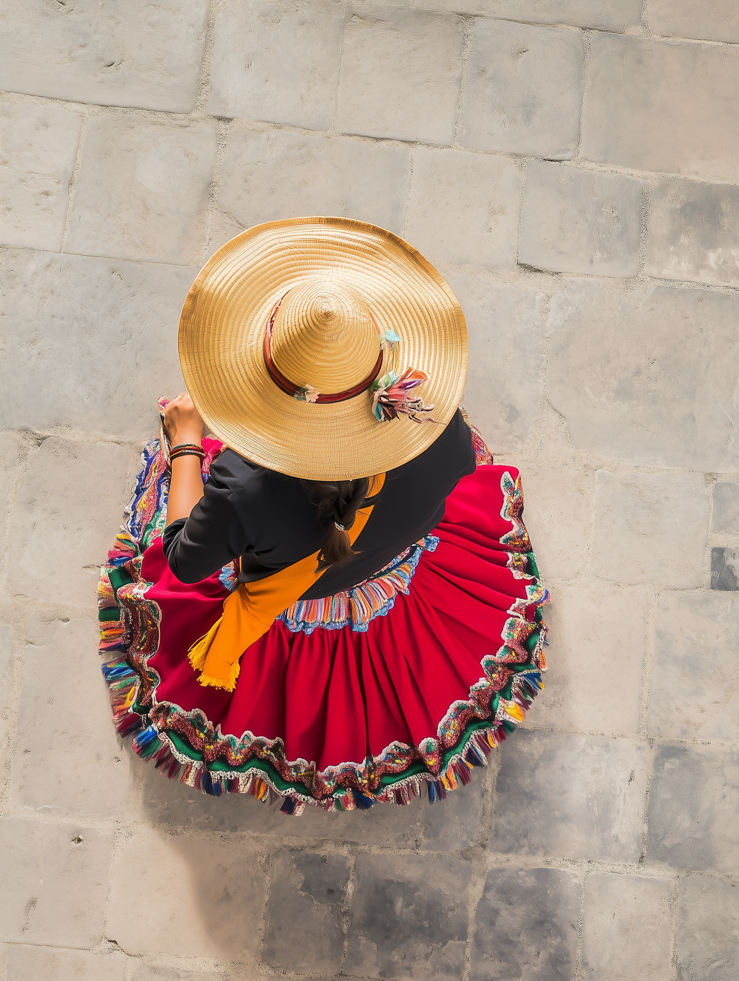 Top-down view of a person in traditional Andean attire with a red embroidered skirt, yellow scarf, and straw hat on a stone-paved surface.