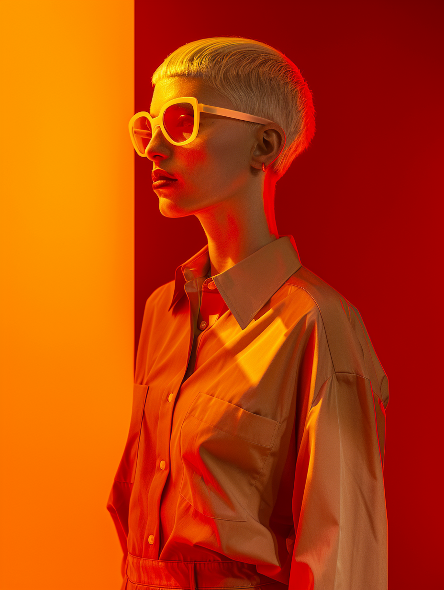 Stylish person with platinum hair and bold sunglasses against a vibrant orange-red background, exuding modern artistic flair.