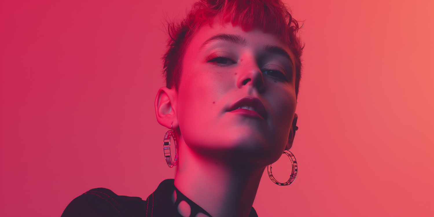 Confident person with short hair and hoop earrings in dramatic red lighting, exuding boldness and style.