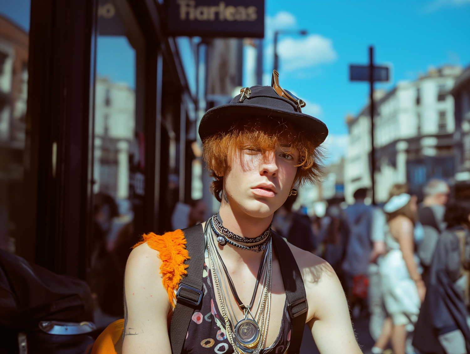 Young man with eclectic style in a busy city street, wearing a black hat and colorful top, surrounded by blurred pedestrians.