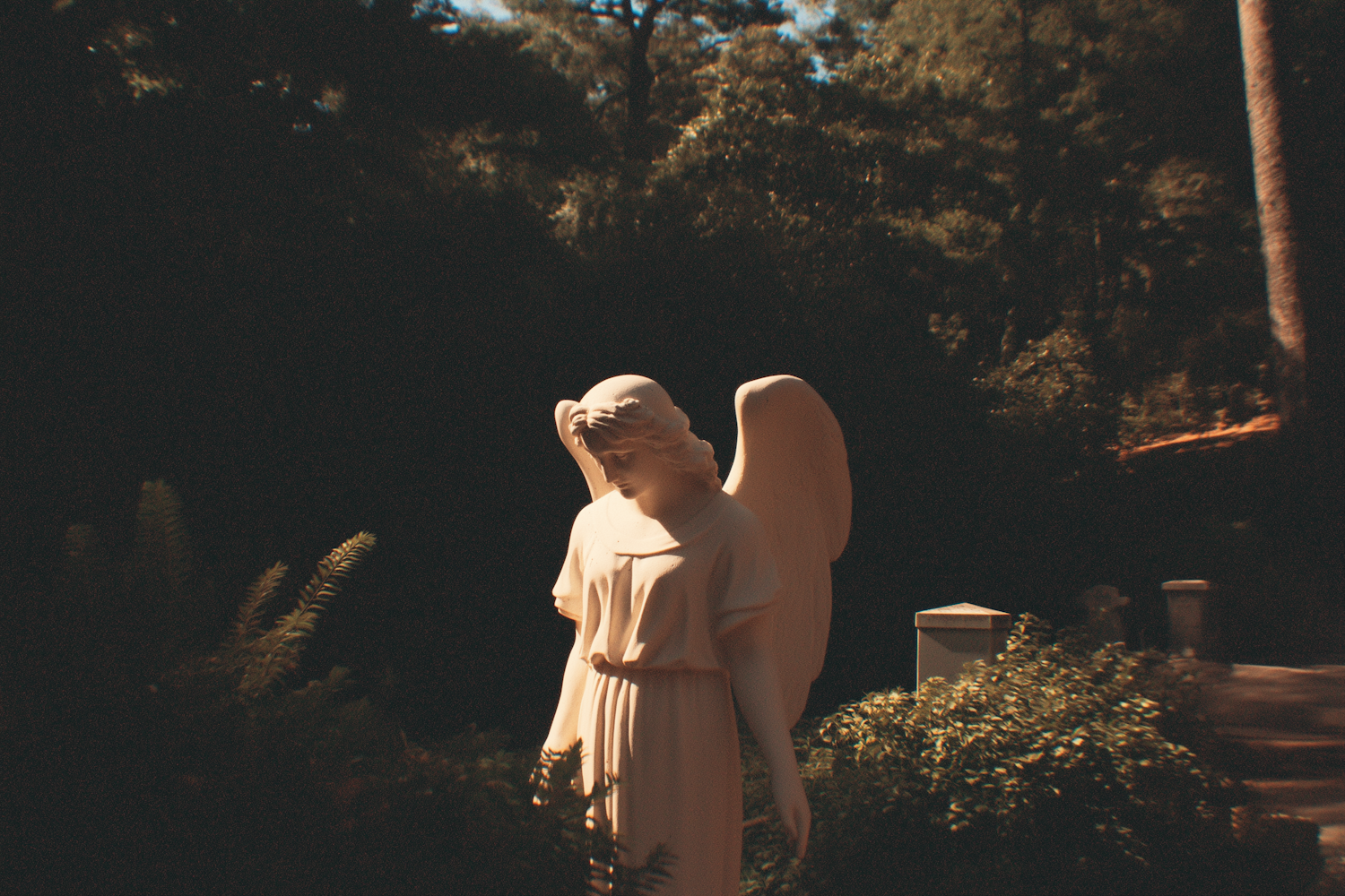 A tranquil scene with a white angel graveyard statue amidst a shaded natural garden. Quiet and reflective atmosphere.