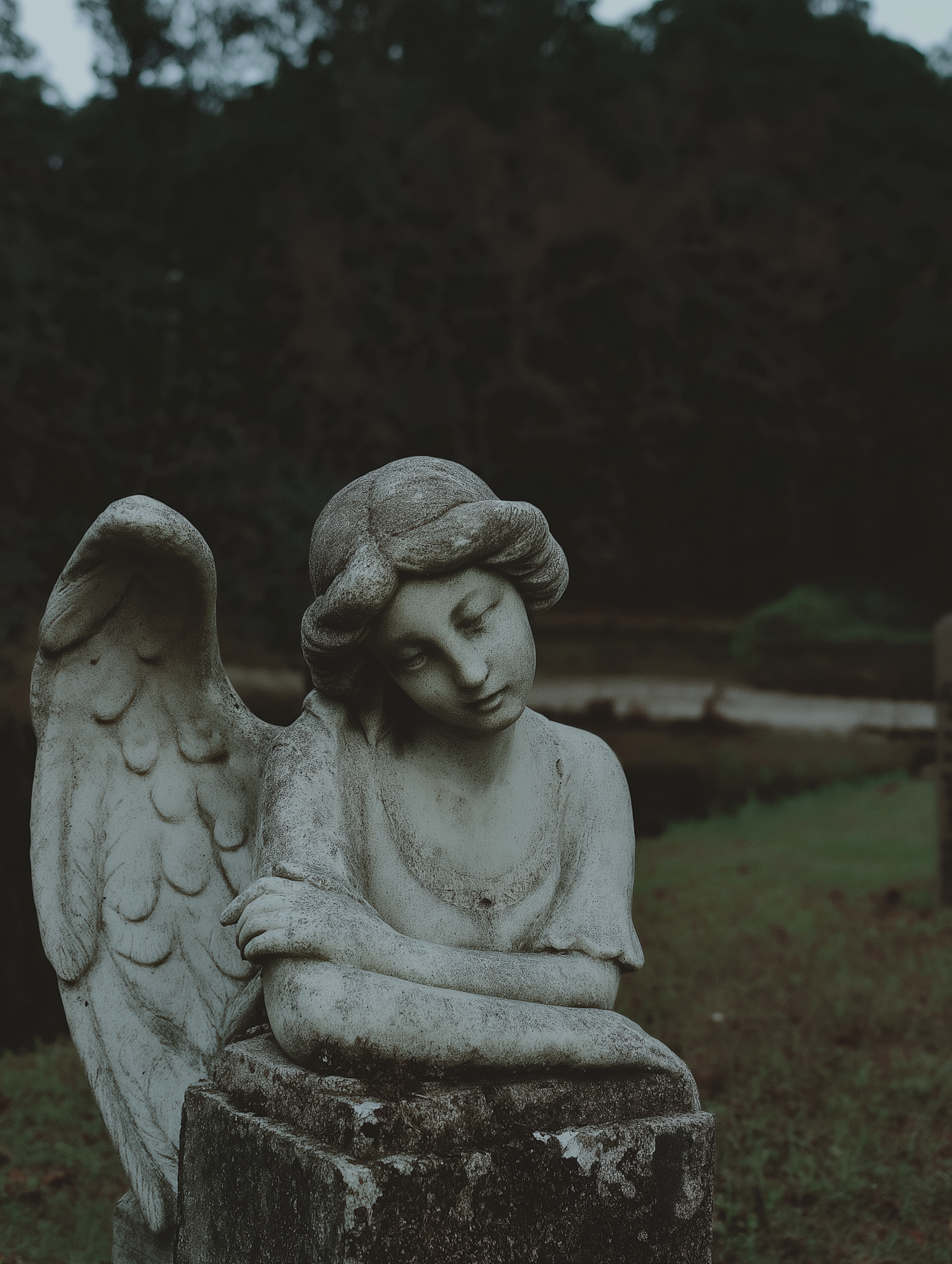 A stone angel graveyard statue rests gracefully, enveloped in natural greenery and subdued light, exuding serenity and timeless artistry.