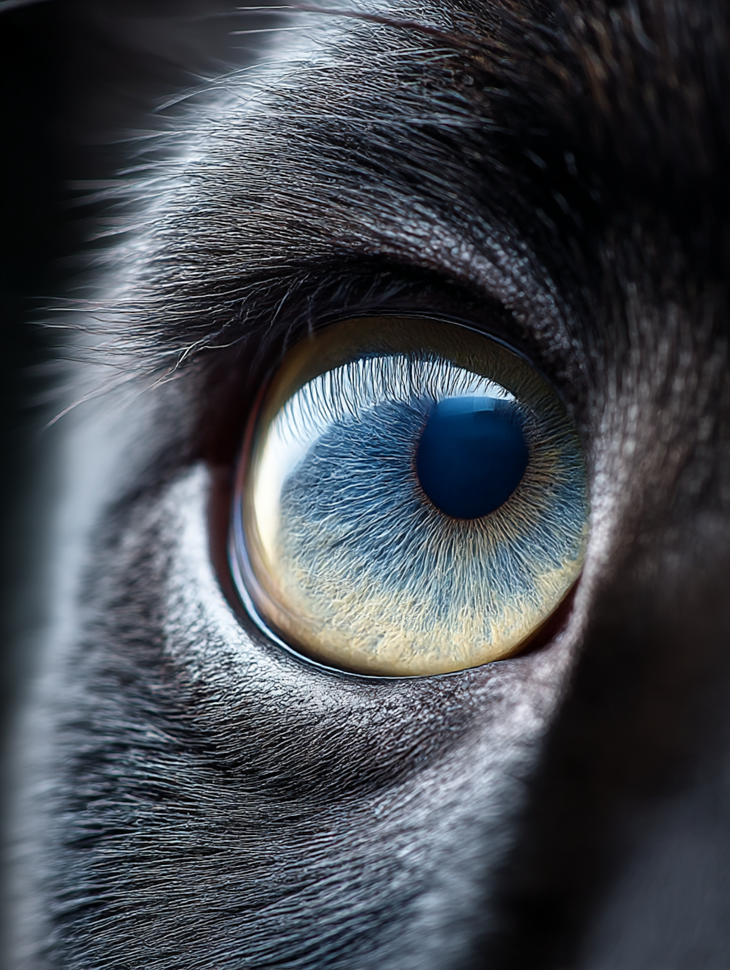 Close-up of an animal's eye with detailed iris and fur textures, showcasing vibrant blue and yellow tones and intricate lighting.