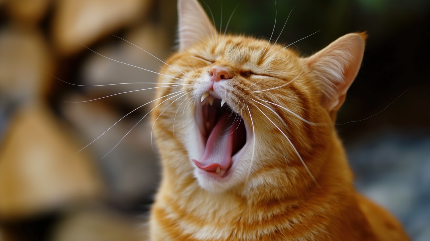 Close-up of a yawning orange tabby cat with closed eyes and perked ears, showcasing its sharp teeth and pink tongue.
