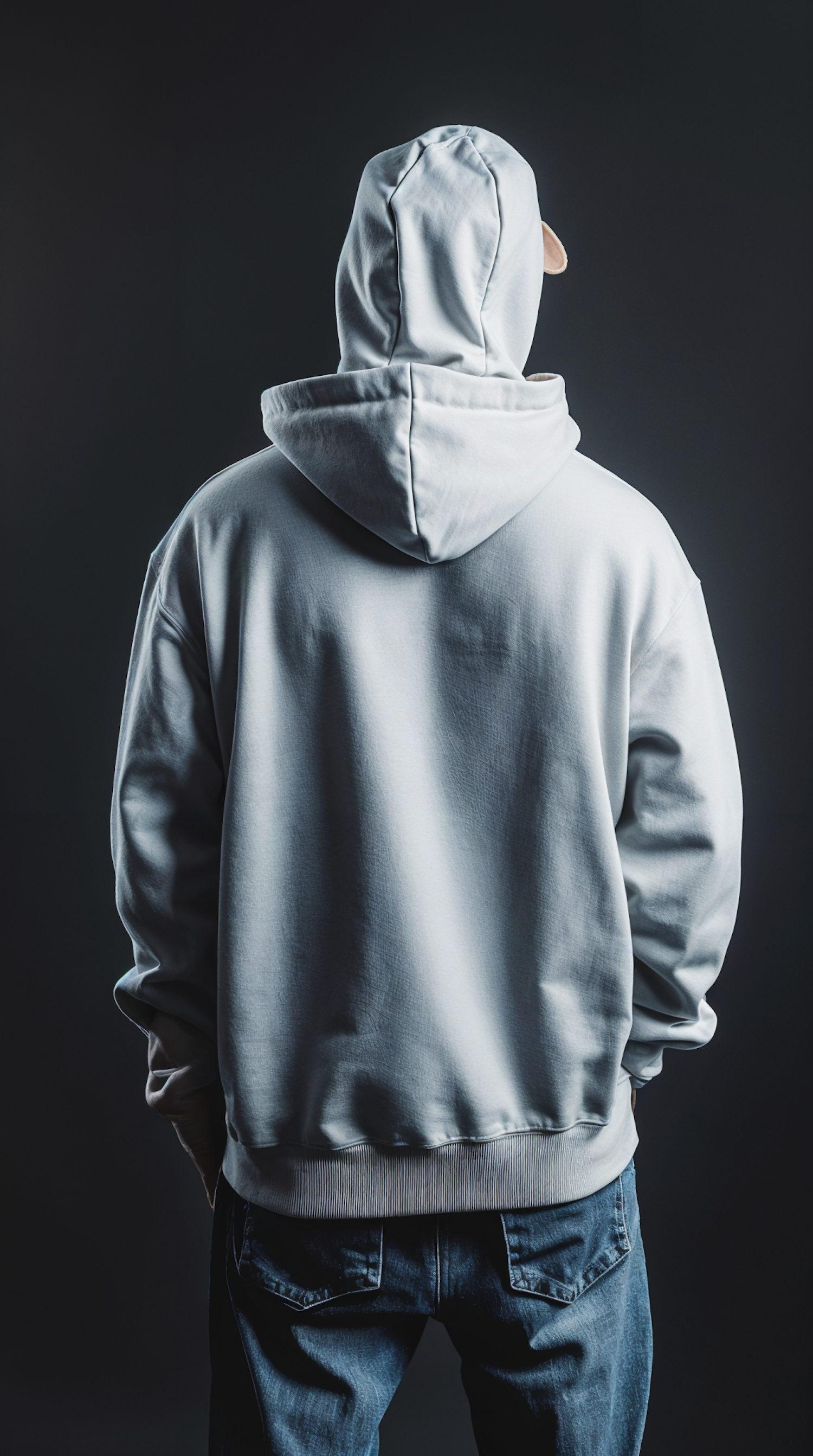 Person in a gray hoodie and blue jeans, facing away, with a dark background. The hood is up, creating a mysterious vibe.