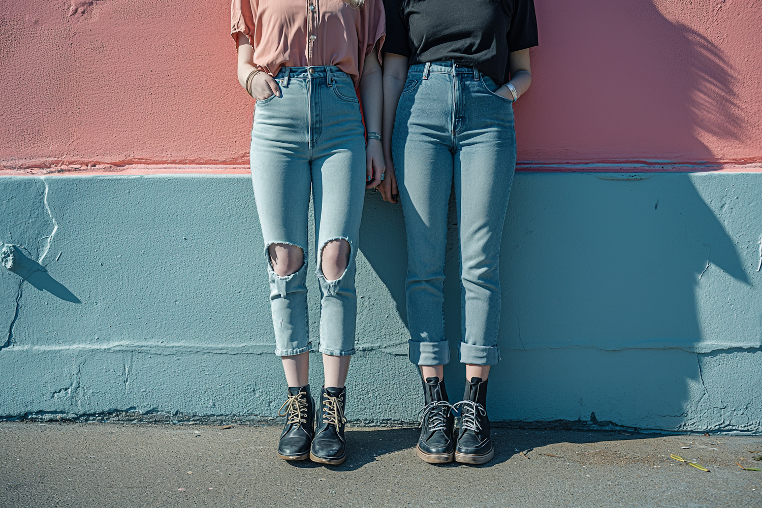 Two people in high-waisted jeans and boots stand against a pink and blue wall, showcasing casual street style fashion.
