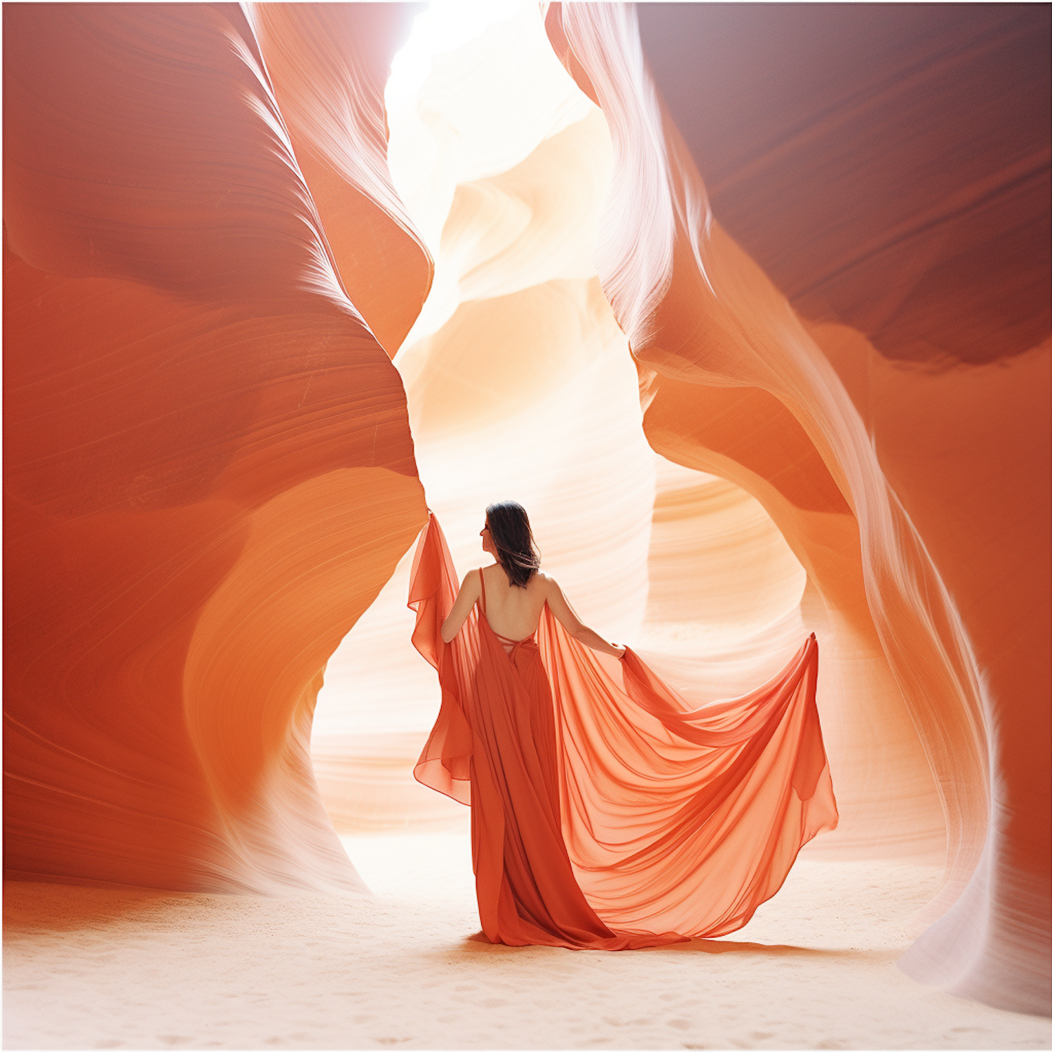 Woman in flowing orange dress stands in a stunning sandstone canyon, with light creating a warm, ethereal glow.