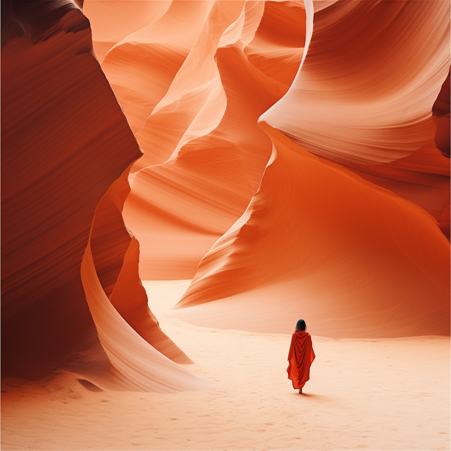 Person in orange robe walking through a stunning sandstone canyon with vibrant orange-red walls and soft, sandy floor.