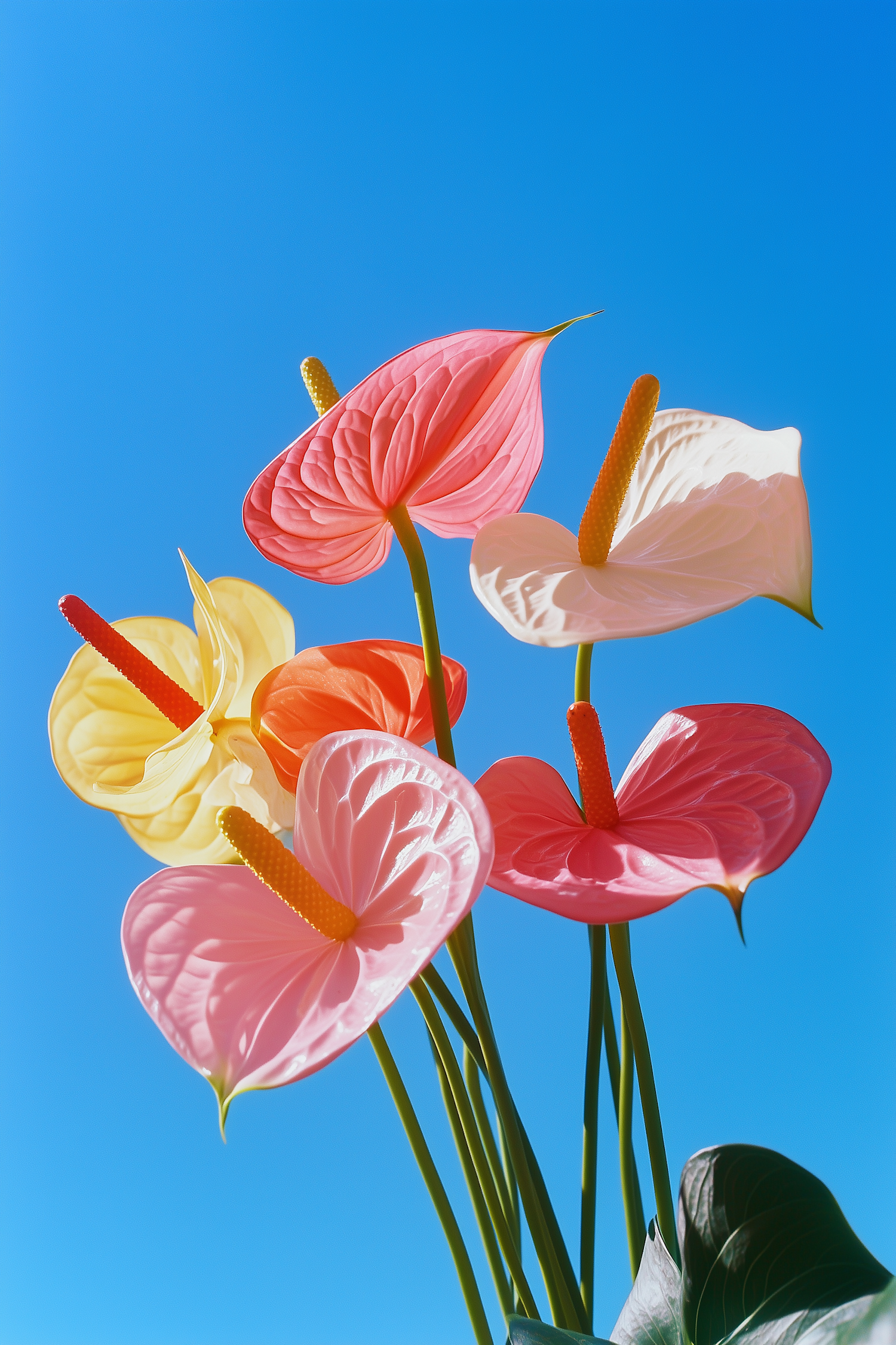 Bright anthurium flowers in pink, red, yellow, and white pop against a vivid blue sky, creating a cheerful and vibrant scene.