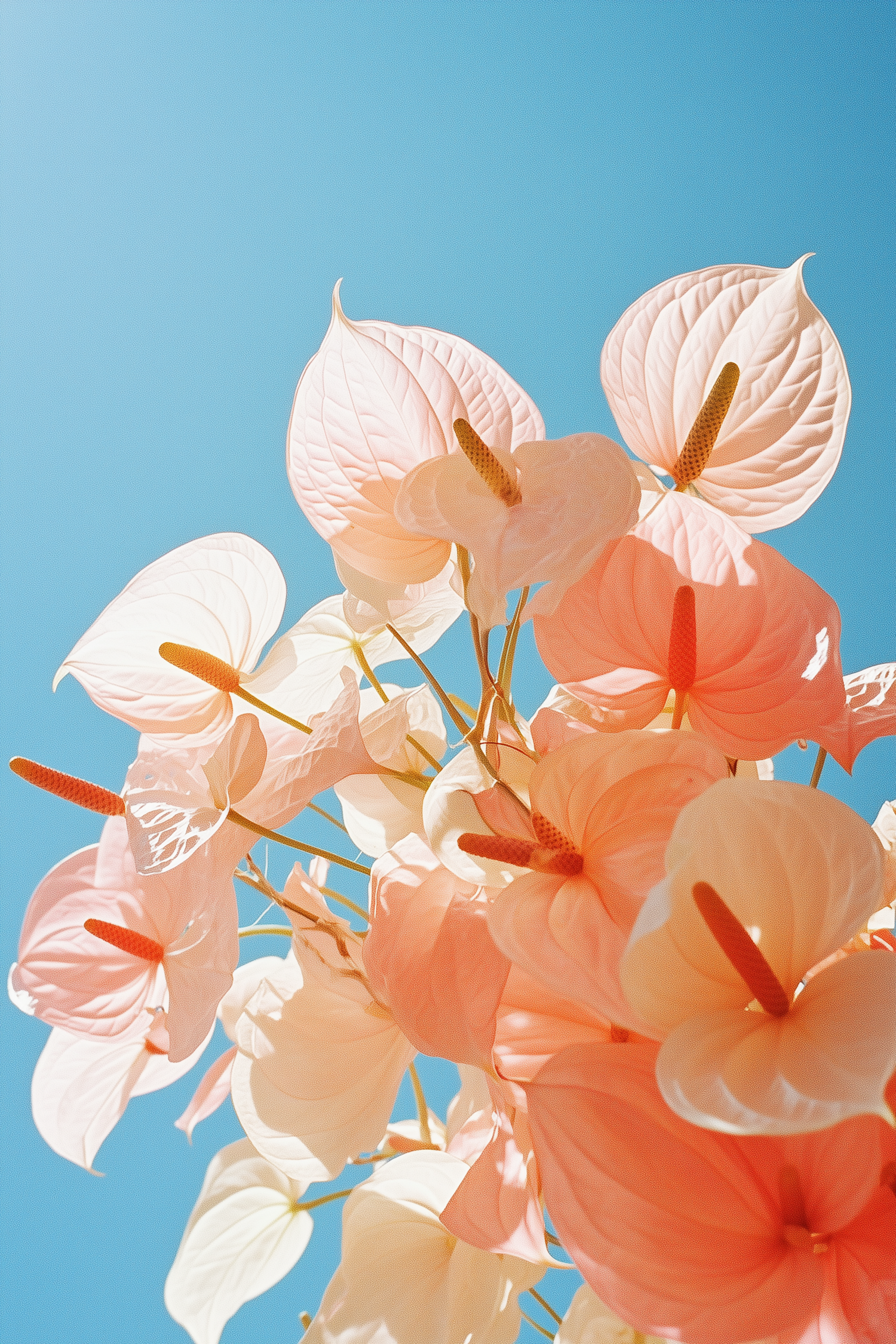 A cluster of pastel anthurium flowers with heart-shaped petals and orange spadices, glowing under sunlight against a bright blue sky.