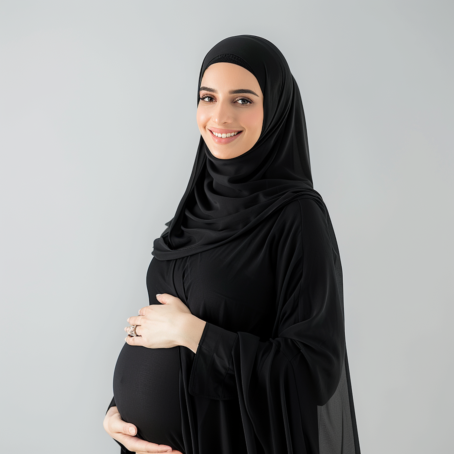 Pregnant woman in black hijab smiling warmly, cradling her belly against a light background. Elegant and serene expression.