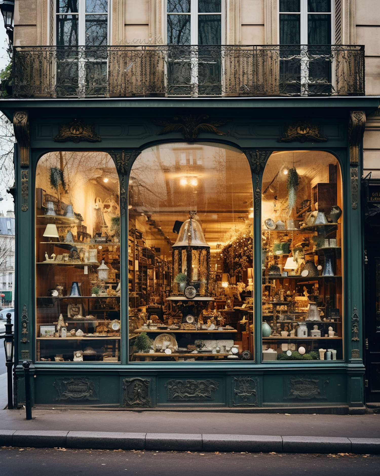 Charming antique shop with vintage facade, deep green exterior, and eclectic window displays. Warm lighting highlights unique antiques.