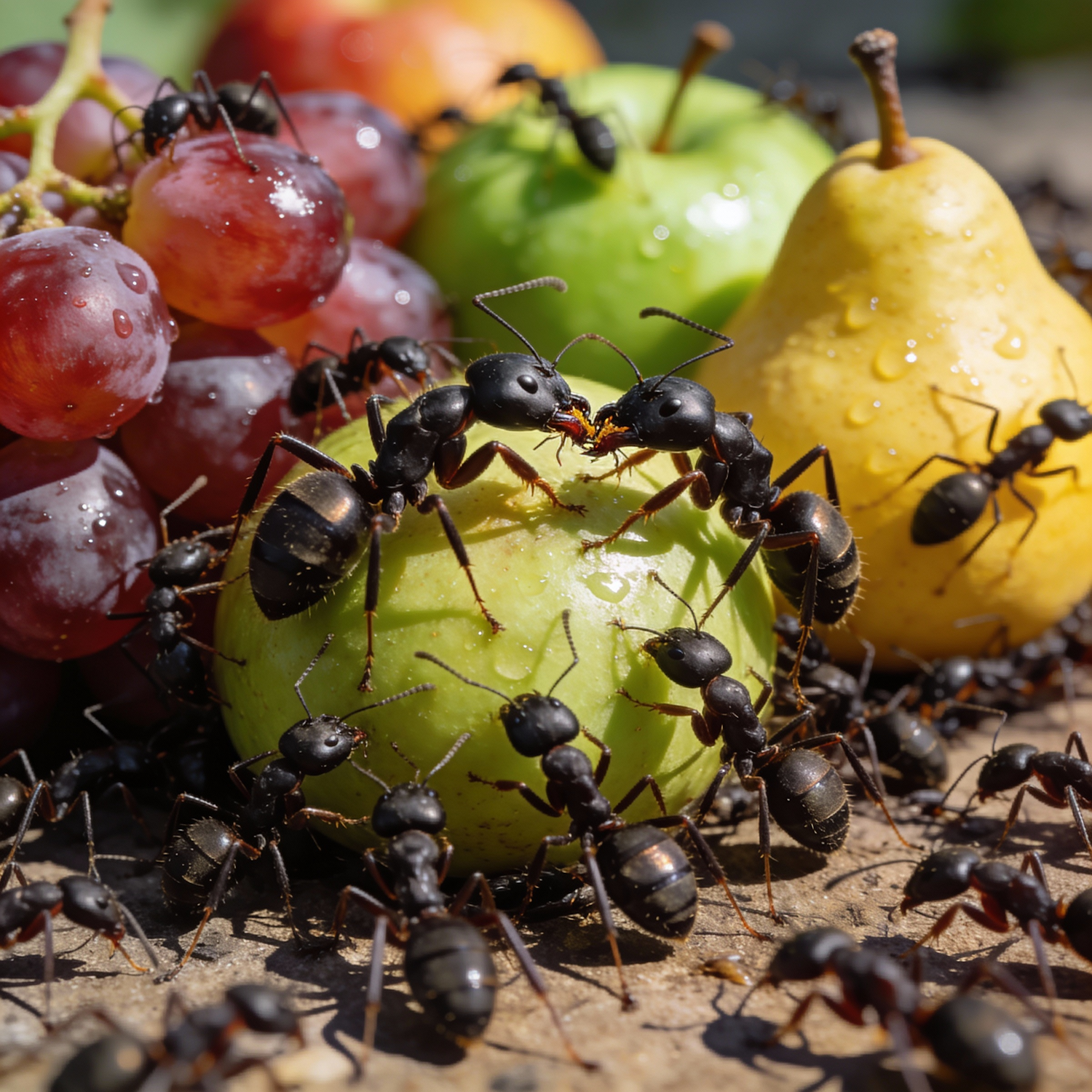 Close-up of ants feeding on fresh fruits like apples, pears, and grapes, showcasing vibrant colors and intricate details.