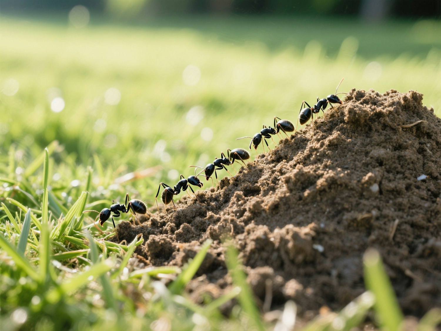 A line of black ants climbing a soil mound in a grassy field, captured in a sunny, natural setting with a blurred green background.