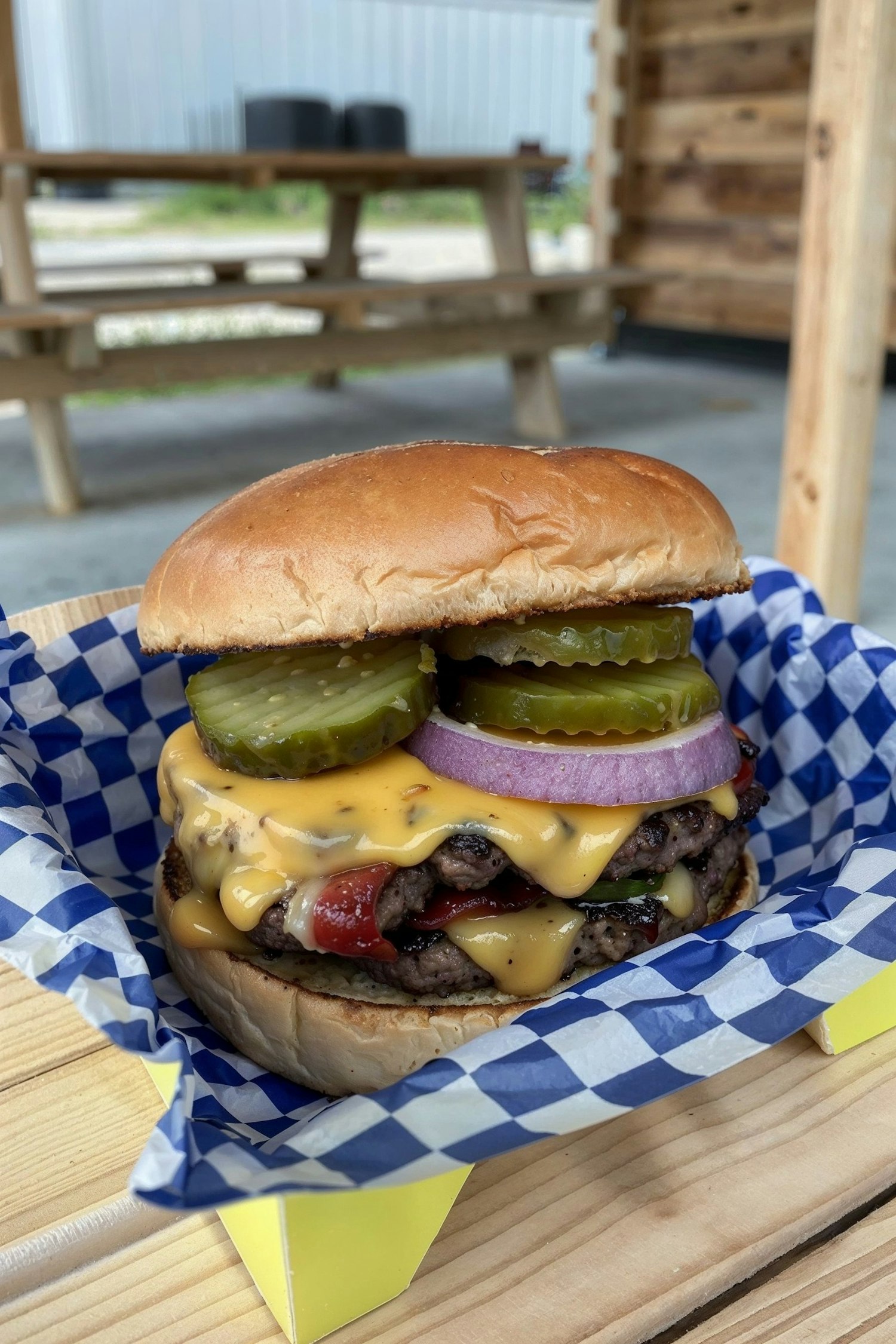 Delicious cheeseburger with melted cheese, pickles, and onions on a wooden table in a rustic outdoor setting.