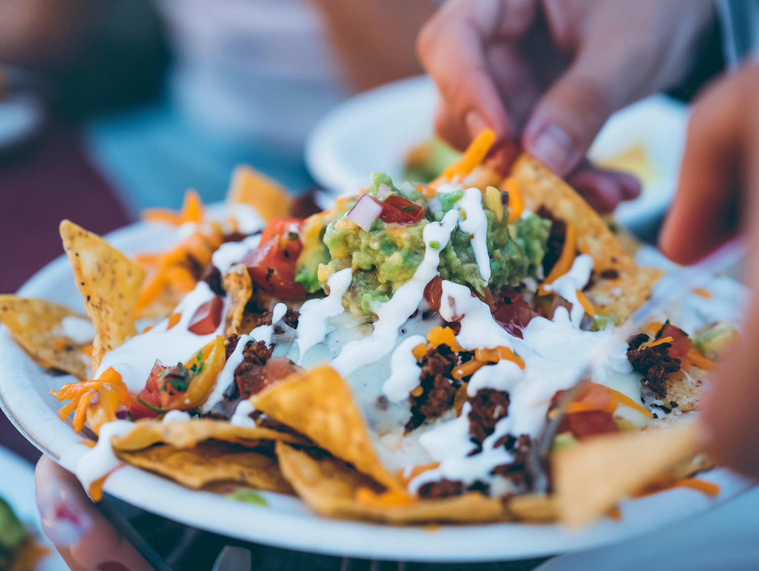 Delicious nachos topped with cheese, beef, guacamole, and sour cream, perfect for sharing at a casual gathering.