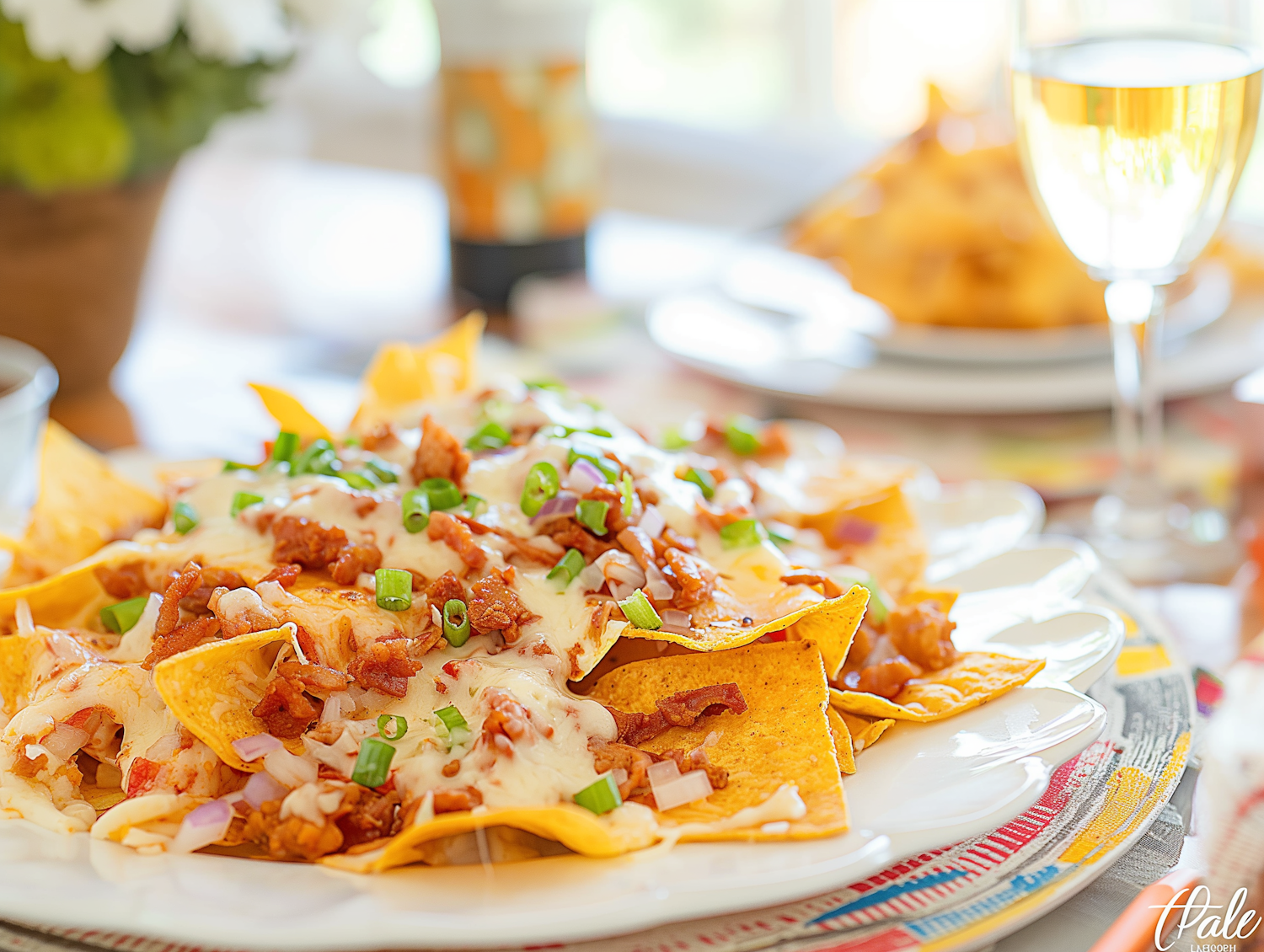 Delicious nachos topped with cheese, bacon, and green onions, paired with a glass of white wine on a colorful placemat.