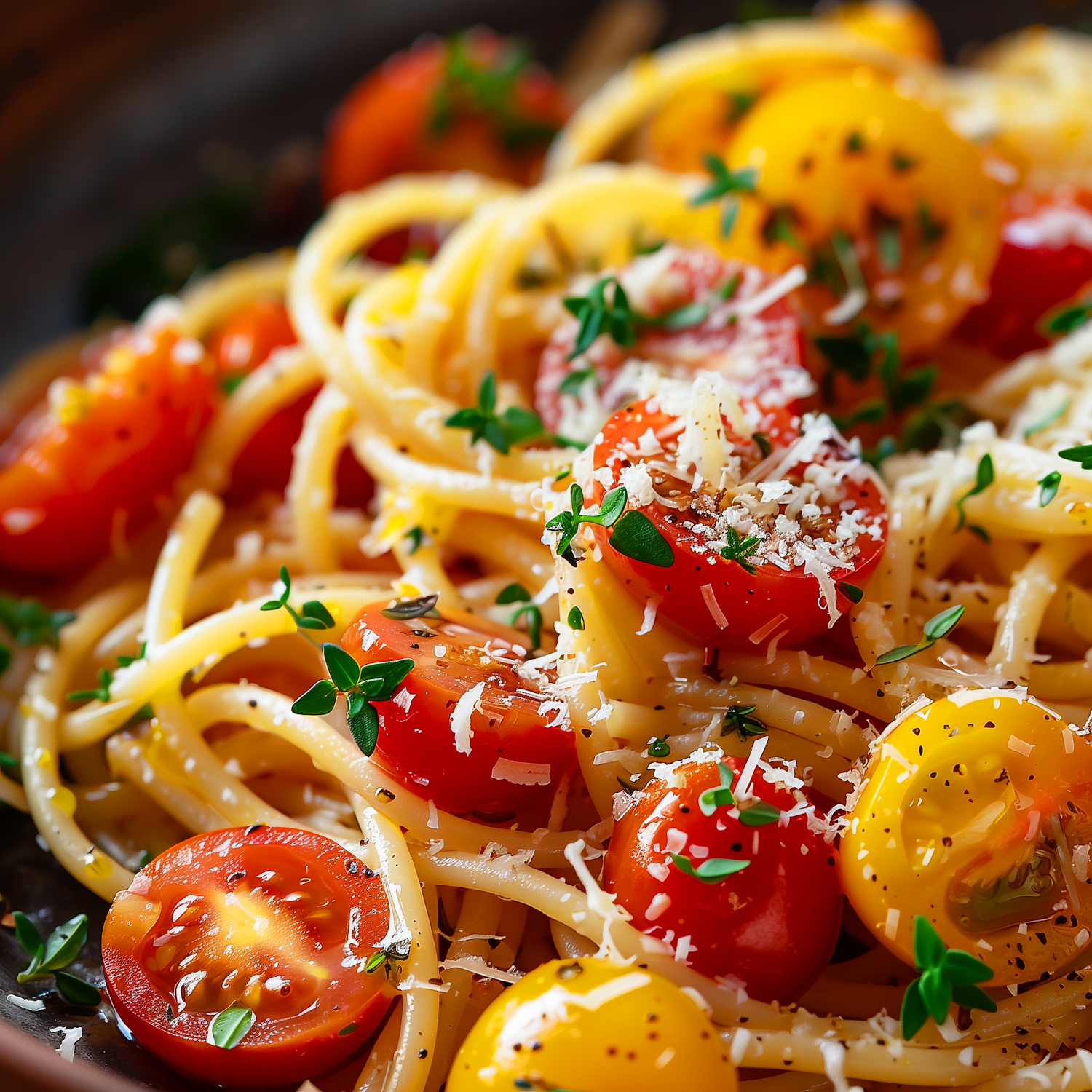 Vibrant spaghetti with cherry tomatoes, fresh herbs, and grated cheese, seasoned with black pepper and olive oil.