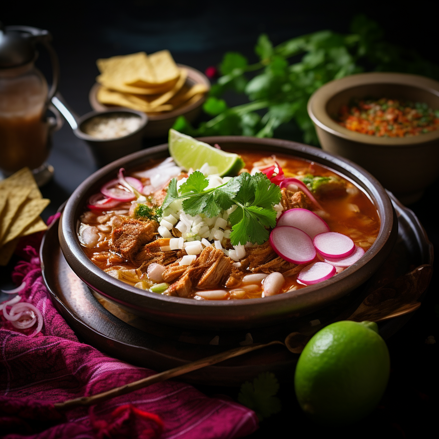 Delicious Mexican pozole with pork, radishes, cilantro, and lime, surrounded by tortilla chips and salsa for a vibrant meal.