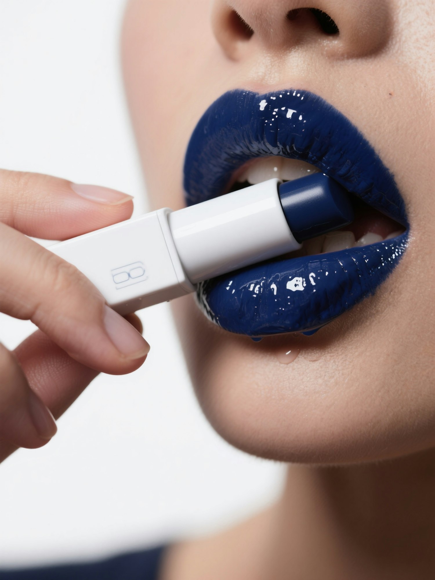 ultra-realistic beauty editorial photo, high contrast studio lighting, clean white background, extreme close-up of glossy lips wearing deep navy blue lipstick, creamy texture with visible highlights and subtle smudges, glossy skin around the mouth with visible pores, lip contours well defined, no branding visible, hand holding a blank lipstick tube gently touching the lower lip, packaging fully unbranded — no logo, no label, no design, confident and bold mood, wet-look finish, high-end minimal aesthetic