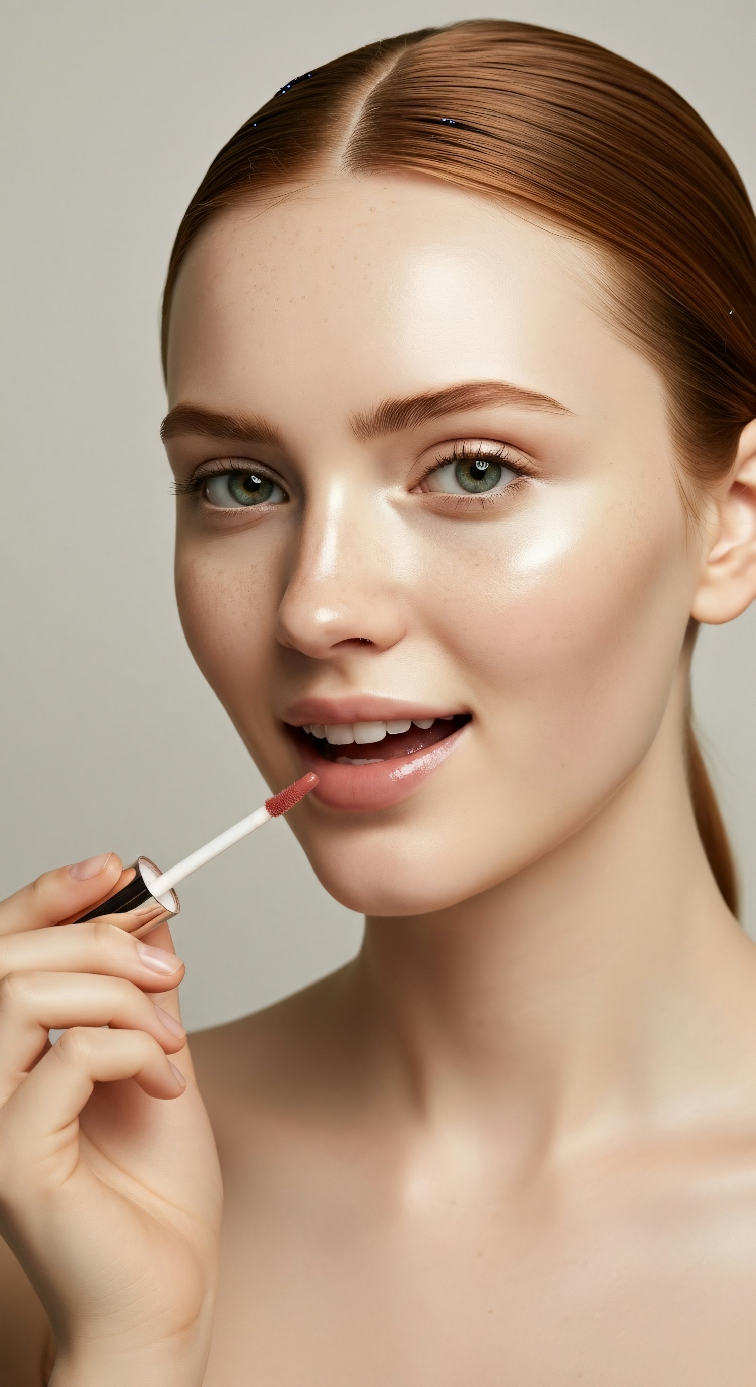 A young woman with fair skin and green eyes applies pink lip gloss, showcasing a natural and radiant look against a neutral background.