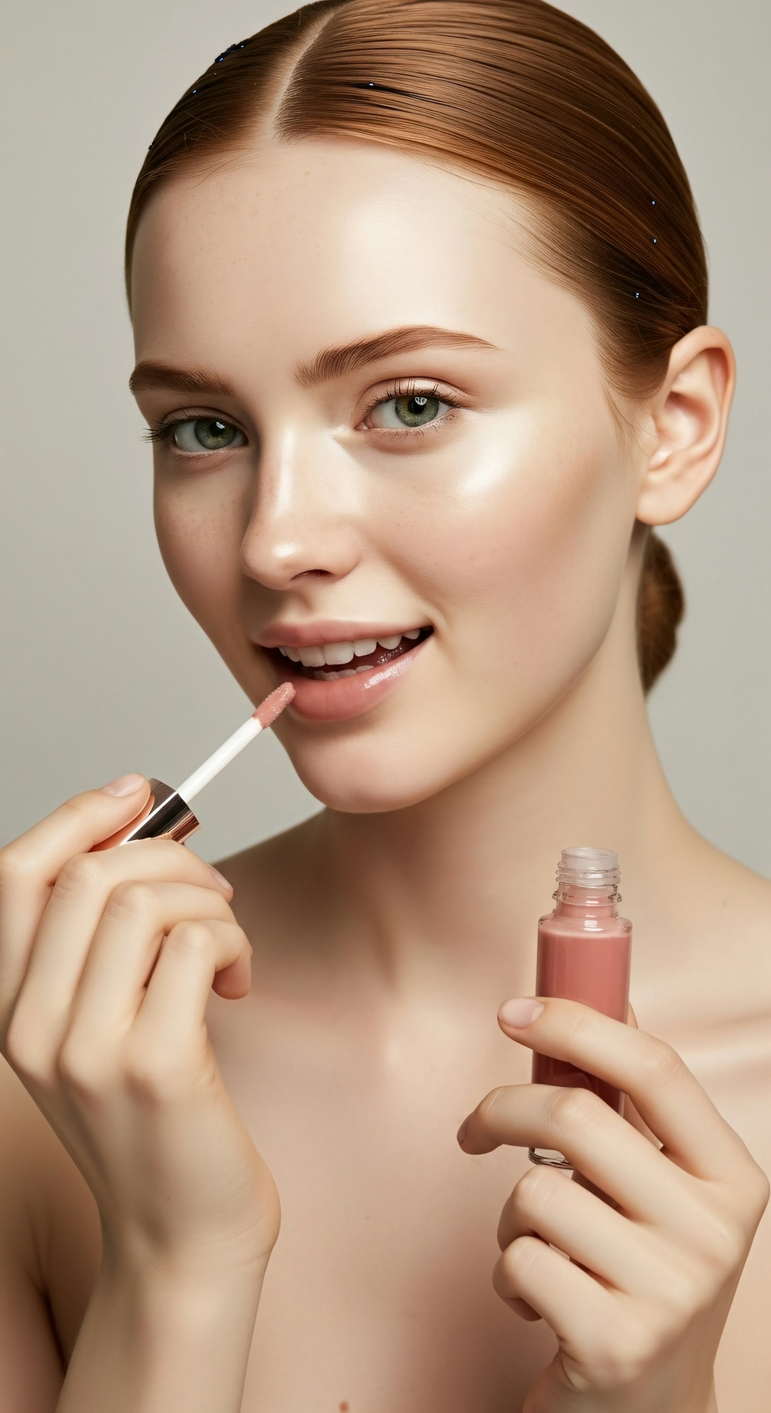 A young woman with fair skin and auburn hair applies soft pink lip gloss, showcasing a natural and radiant look against a neutral background.