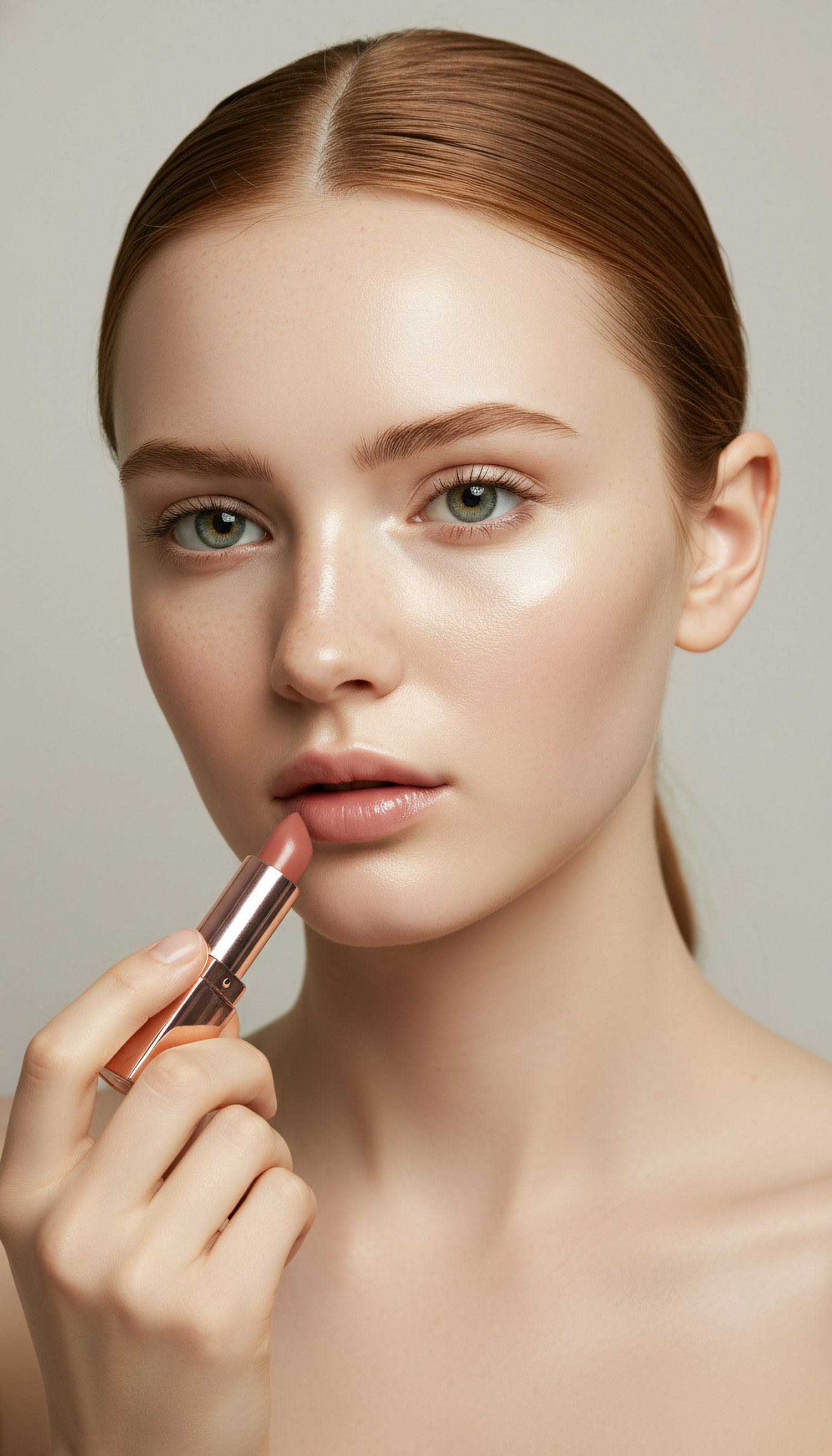 A close-up of a woman applying nude lipstick, showcasing her natural beauty with a soft glow and elegant simplicity.