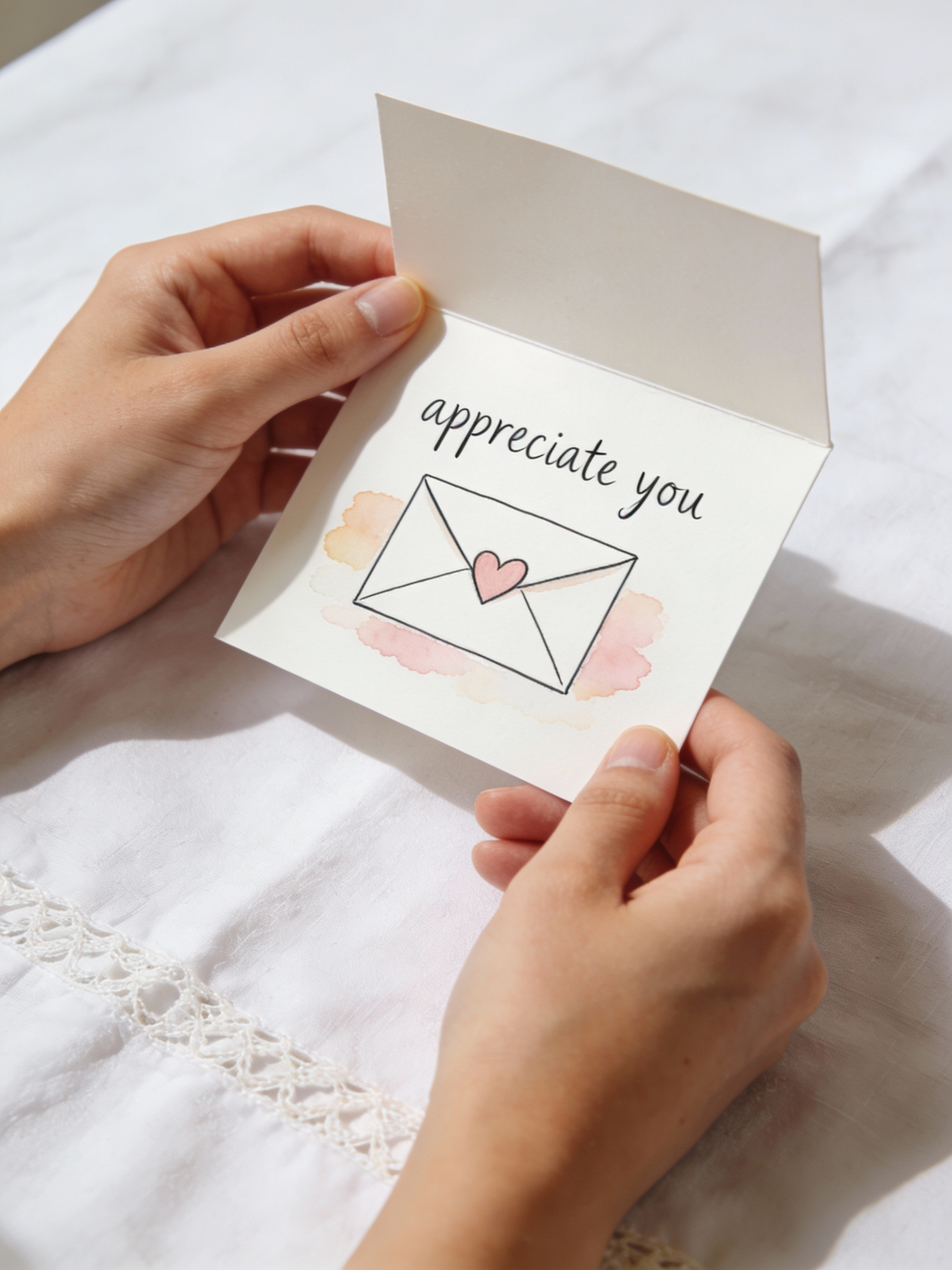 a hand-drawn card with the text "appreciate you" and a simple line art illustration of an envelope with a heart seal, watercolor wash, minimalistic style, holding the card in one's hands, white linen tablecloth background, slightly open, soft daylight, realistic photo, no extra text, no logos, no watermark