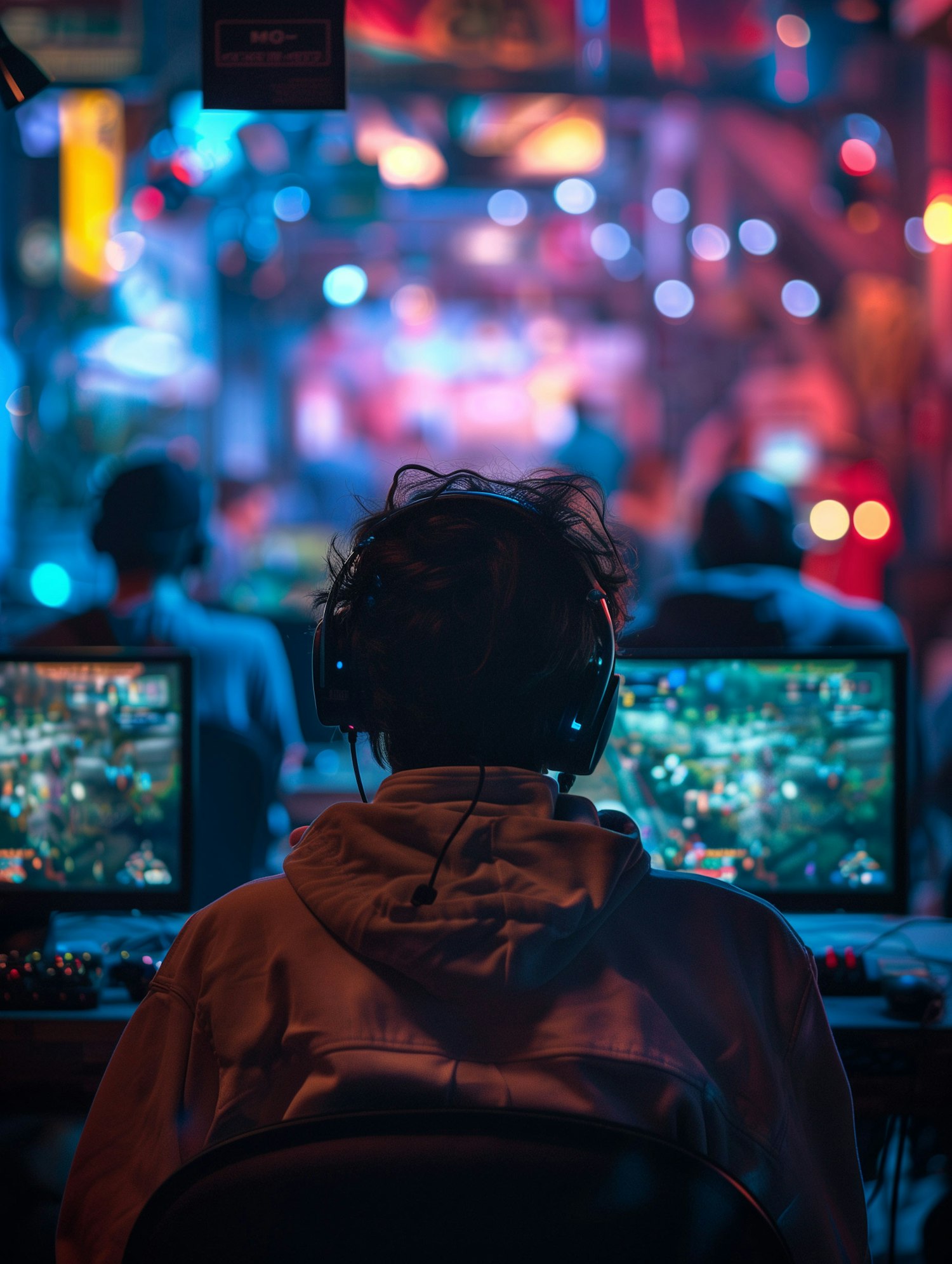 Gamer immersed in a video game at a neon-lit event, wearing headphones and a white hoodie, surrounded by vibrant colors and screens.