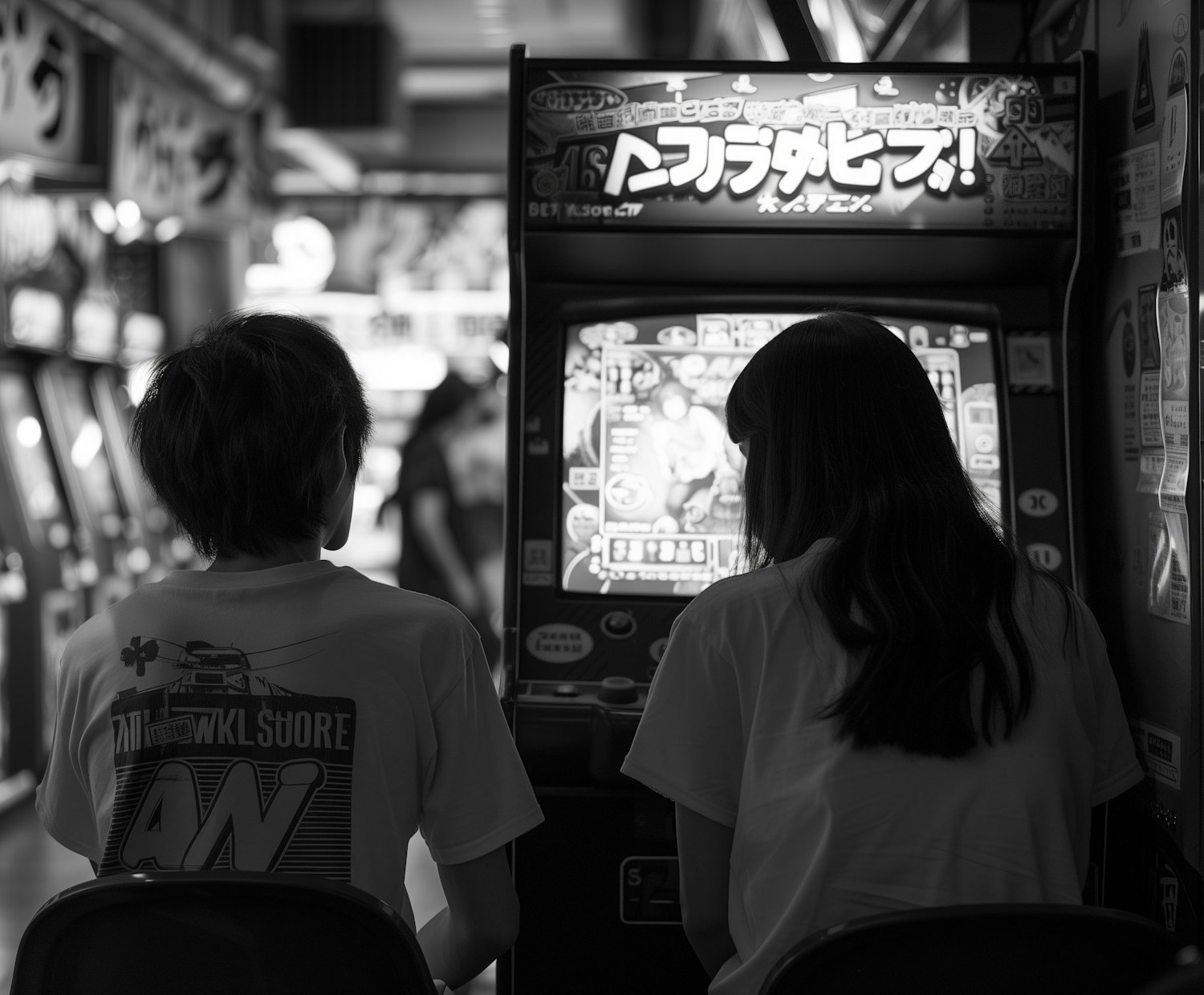 Two people play an arcade game in a nostalgic black and white setting, focused on the screen with vibrant graphics and Japanese text.