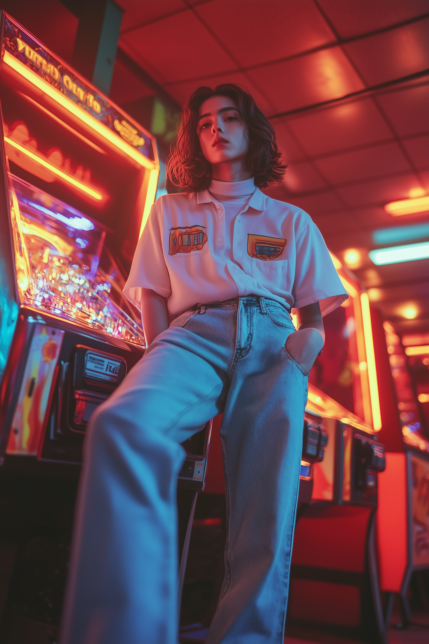 Stylish young person in a neon-lit arcade, wearing a white shirt and jeans, leaning against a pinball machine with a confident pose.