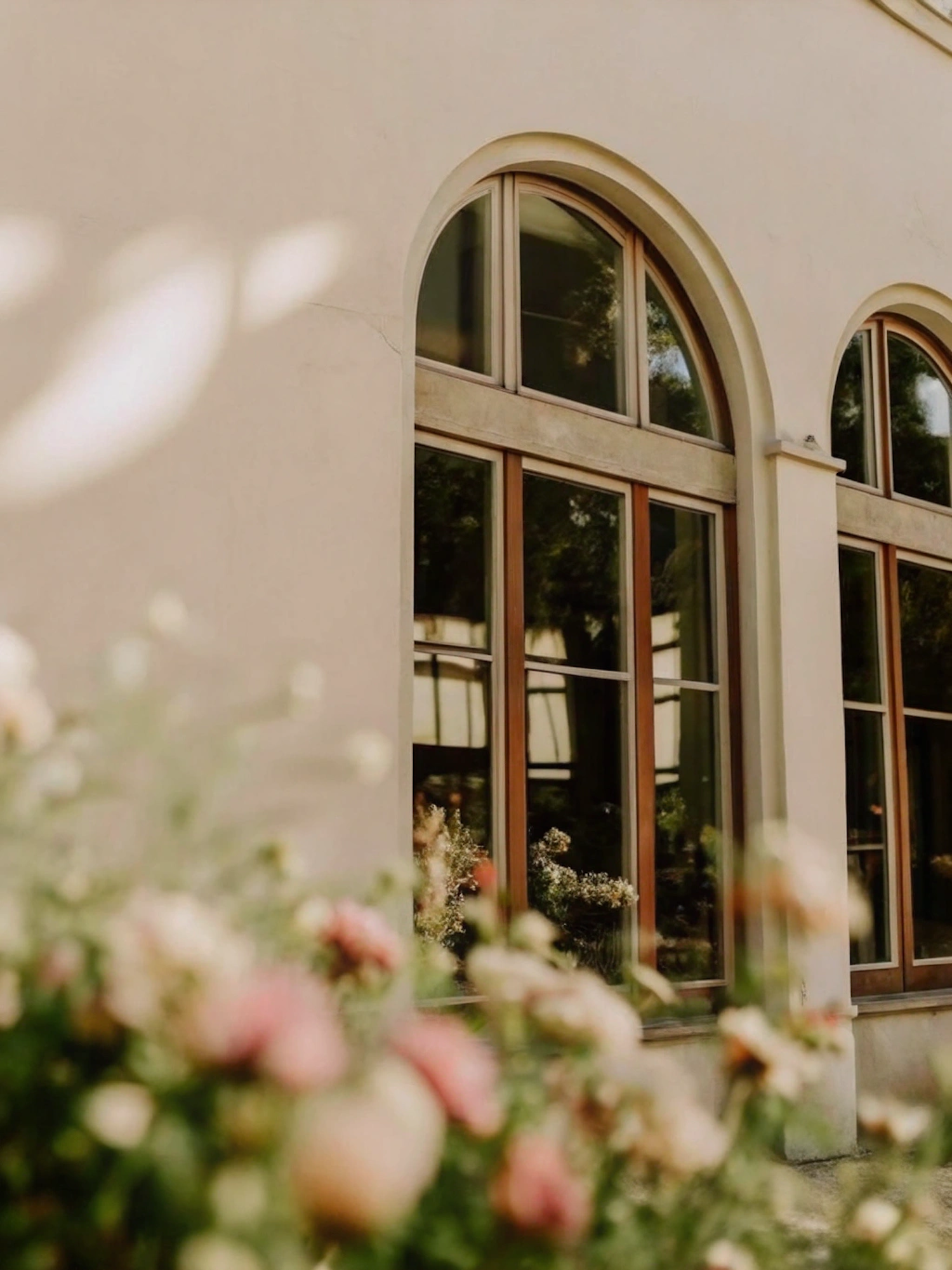 Elegant arched windows on a cream wall with blurred pink and white flowers in the foreground, creating a serene and romantic vibe.