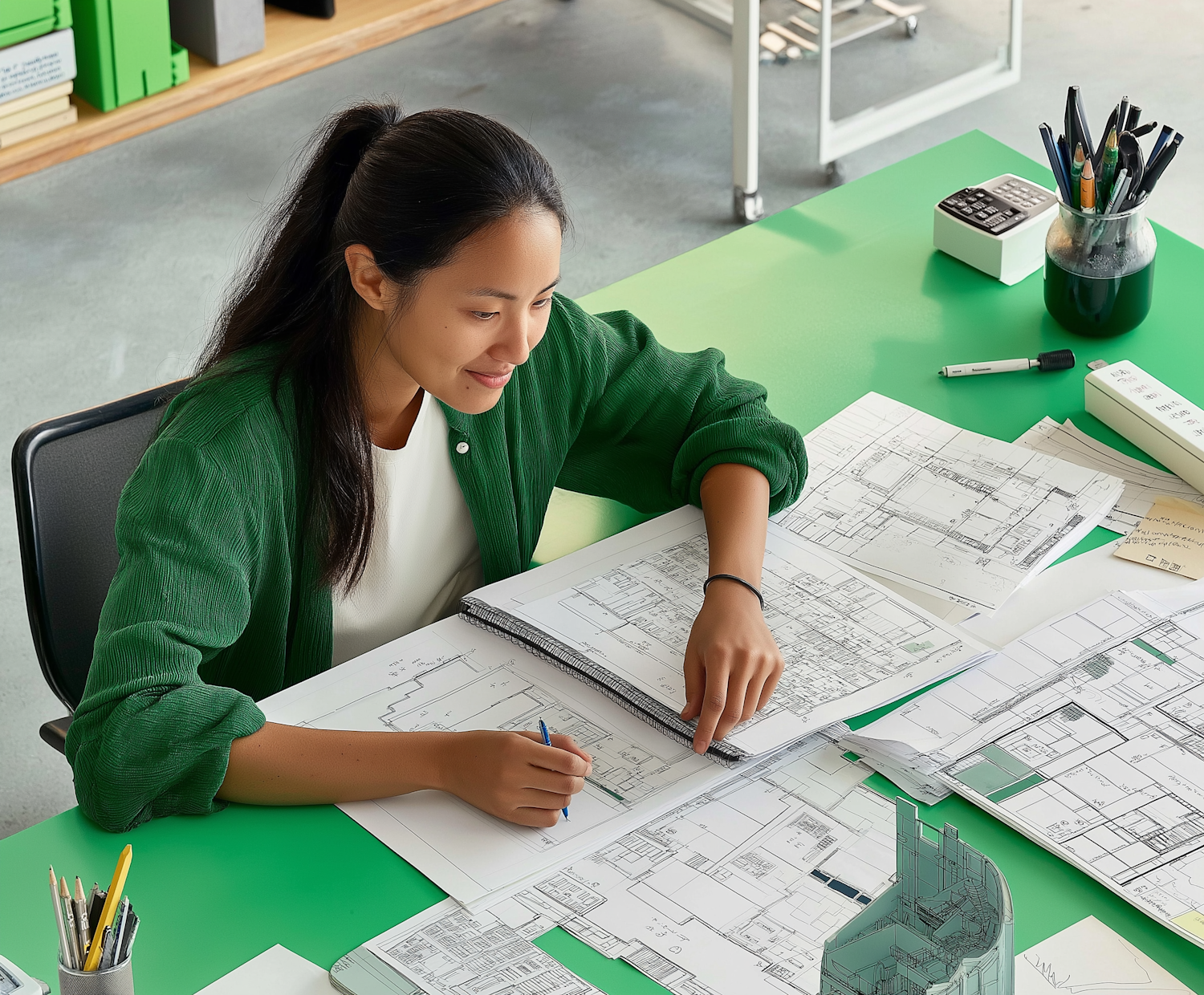 Asian woman reviewing architectural blueprints at a green desk, surrounded by plans and tools, in a focused and creative workspace.