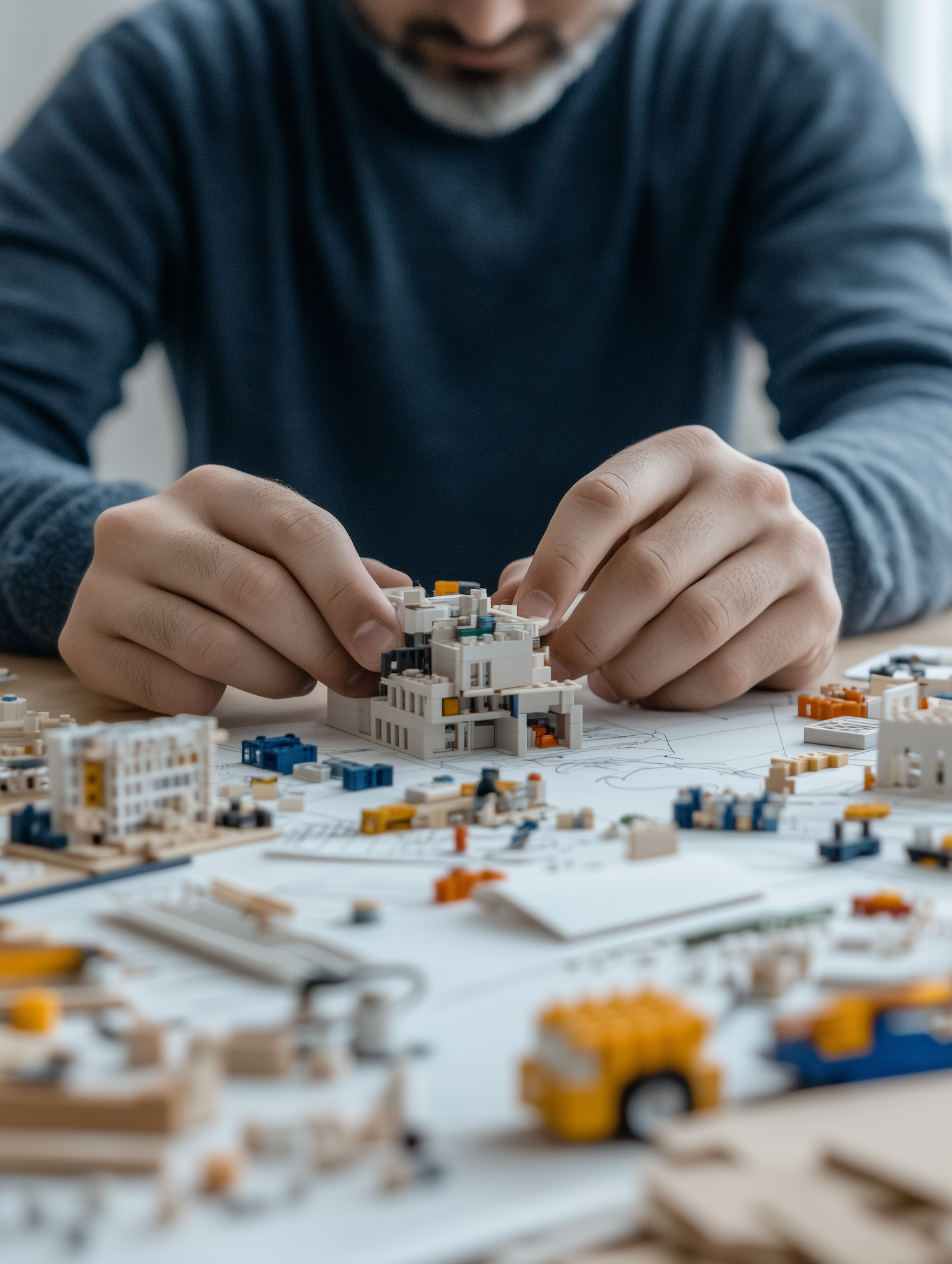 Man assembling a detailed architectural model with building blocks, surrounded by plans and pieces, showcasing creativity and focus.