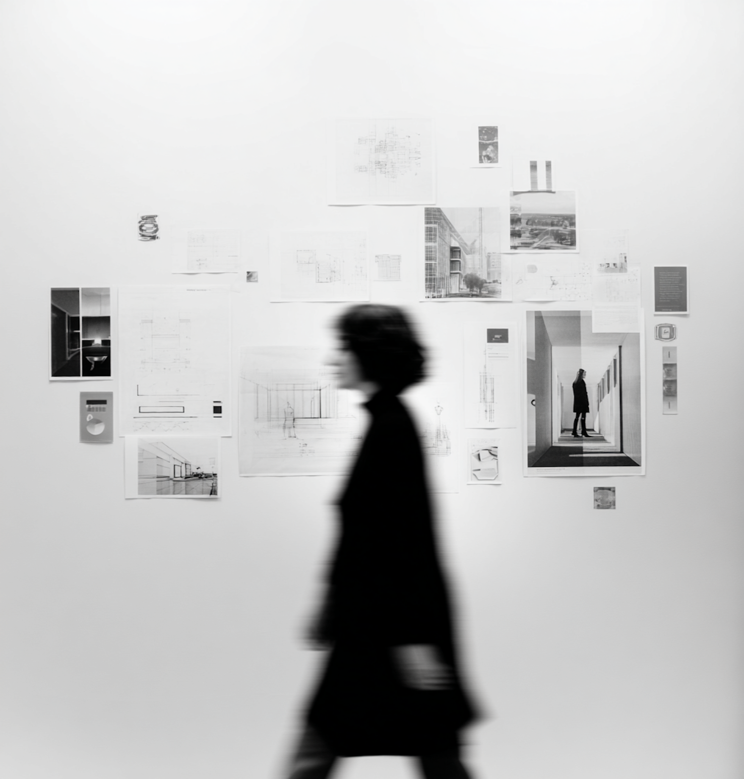 A blurred grayscale scene with a person walking by a wall filled with architectural sketches, plans, and photos.