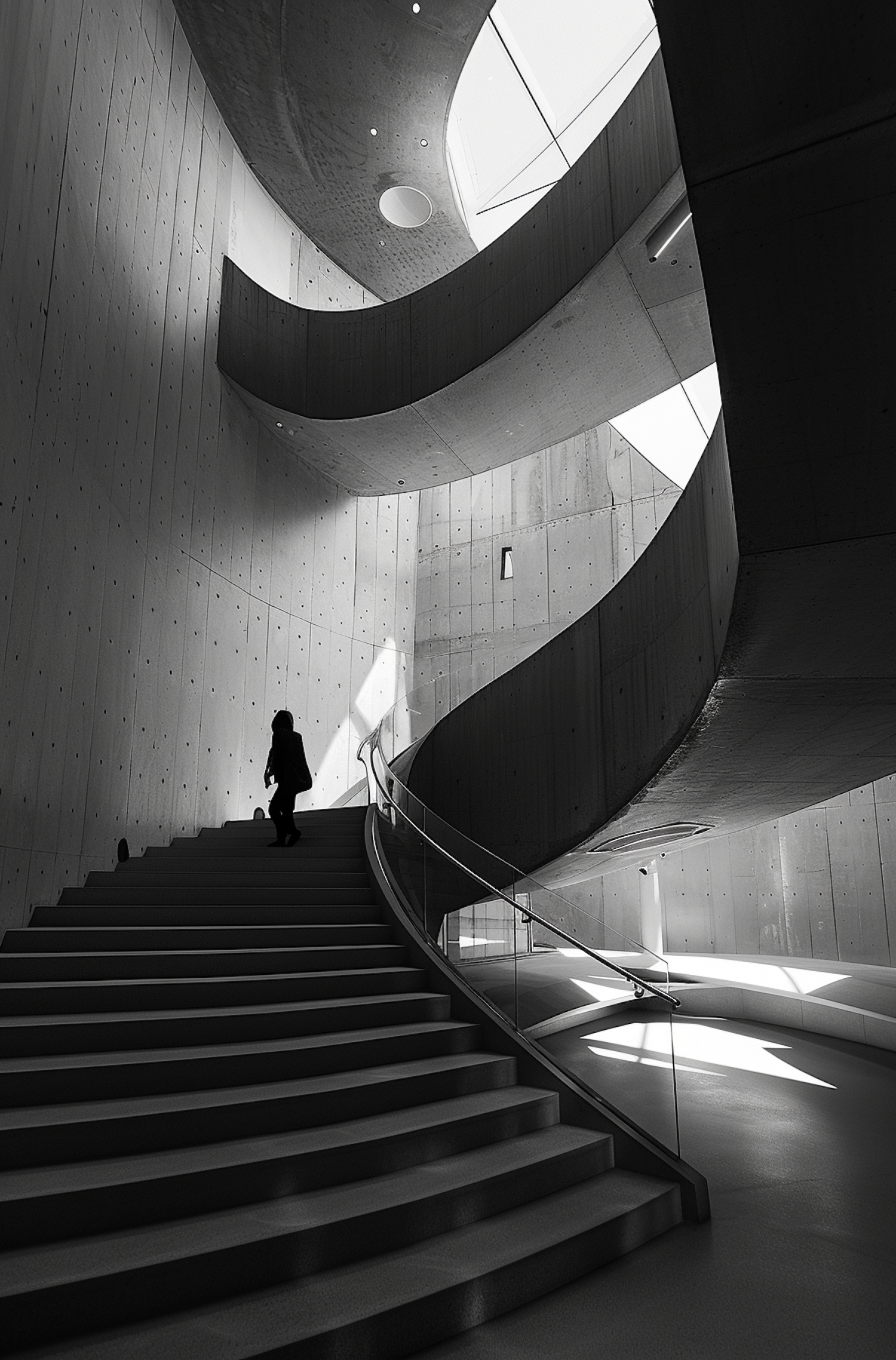 Black and white photo of a modern spiral staircase with dramatic lighting and a silhouetted figure ascending.
