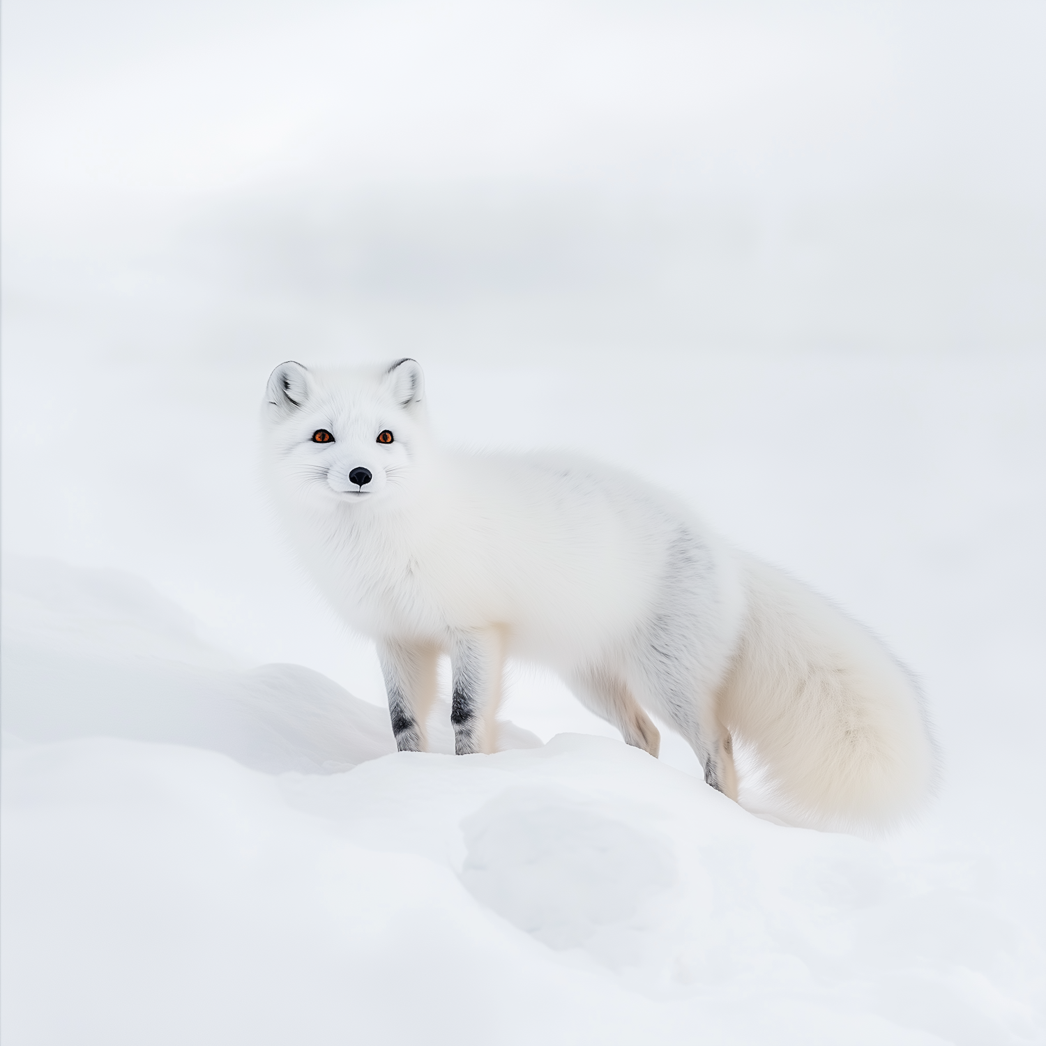 Majestic arctic fox with amber eyes and thick white fur stands on pristine snow, blending beautifully with the serene winter landscape.