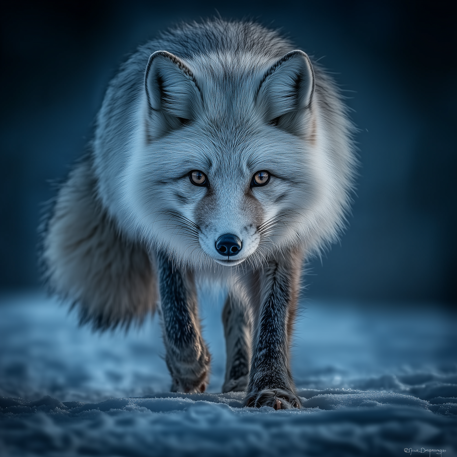 Majestic arctic fox with silvery fur and amber eyes walking through snow under a bluish light, exuding elegance and focus.