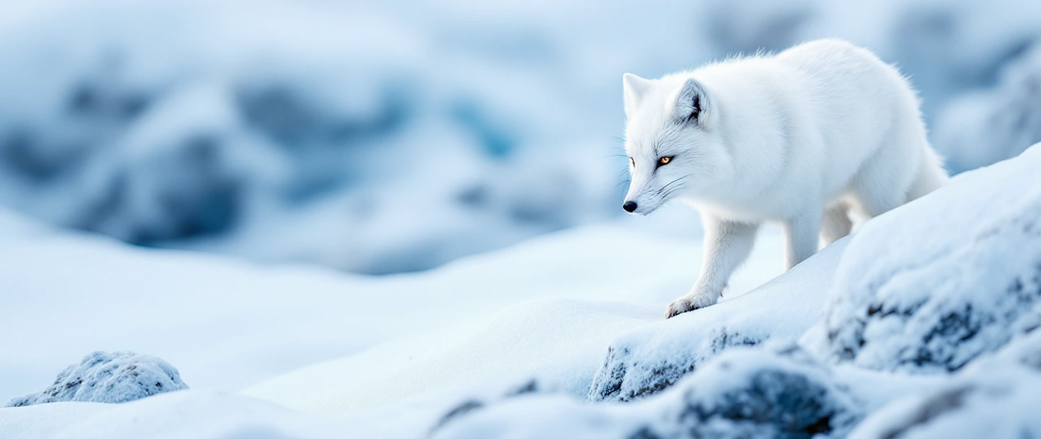 A solitary Arctic fox with a fluffy white coat moves stealthily across a snowy landscape, its amber eyes contrasting the icy surroundings.