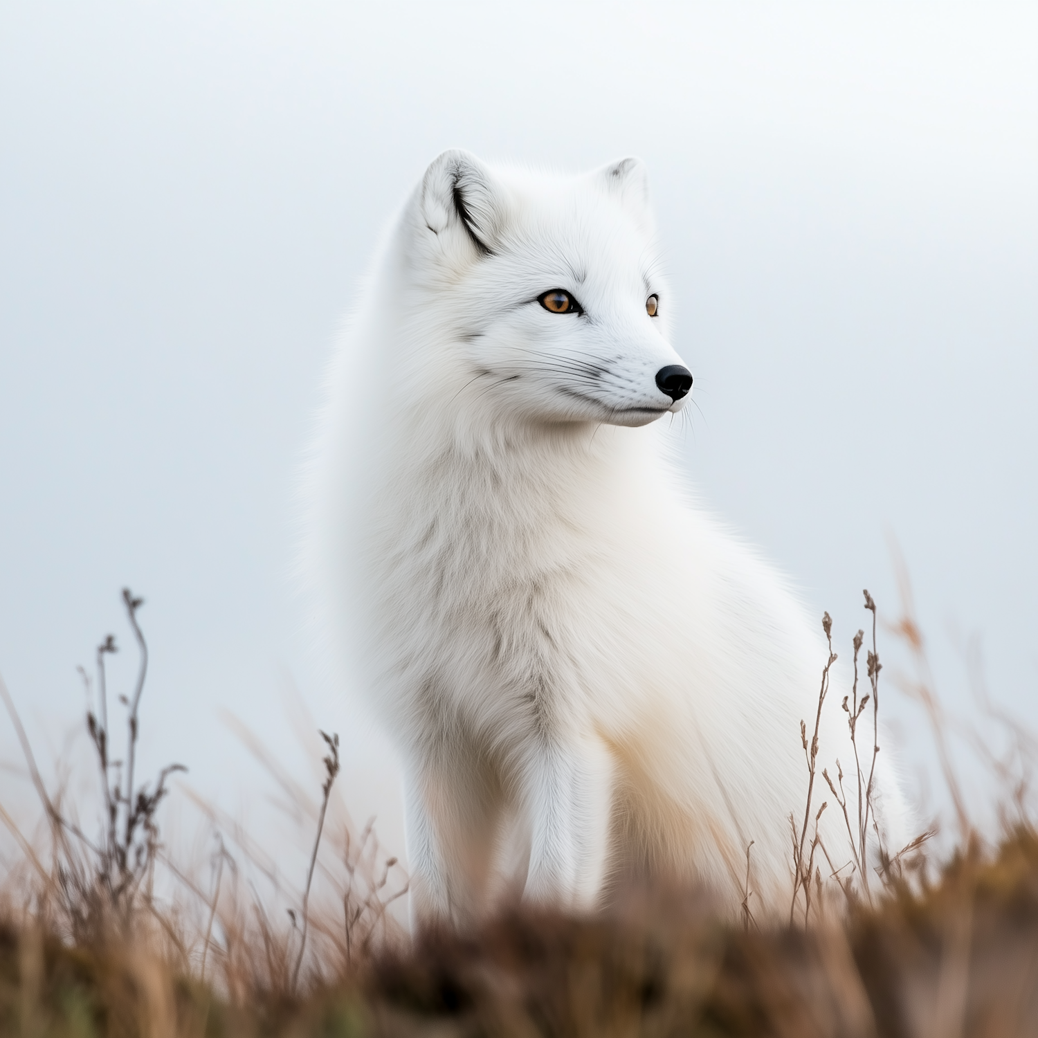 Majestic Arctic fox with white fur and golden eyes in a tundra setting, surrounded by dry grass and an overcast sky.