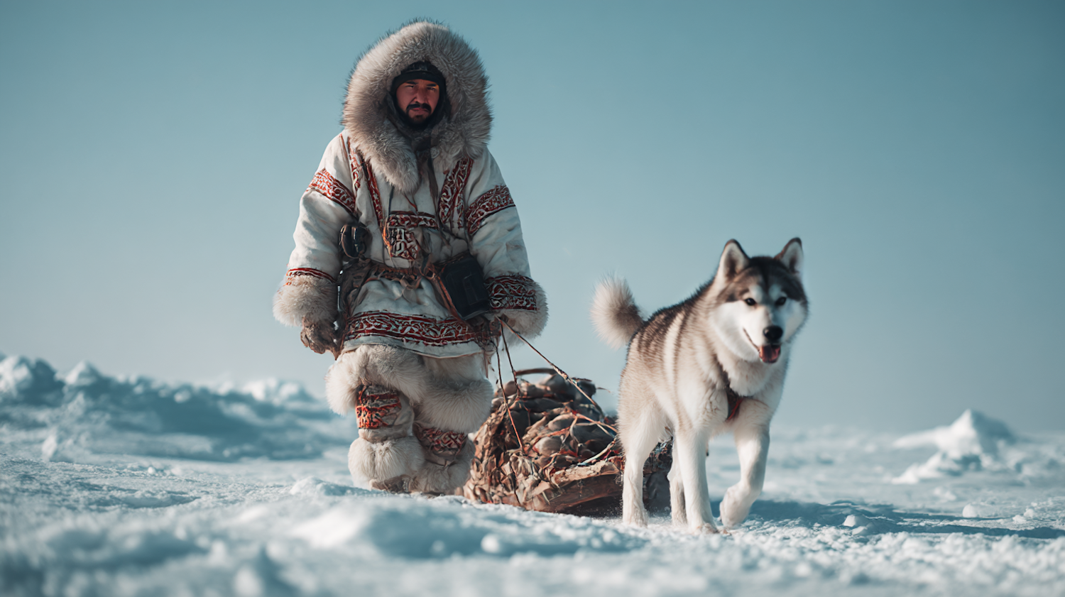 A man in traditional winter attire walks with a husky dog across a snowy landscape, pulling a sled under a clear blue sky.