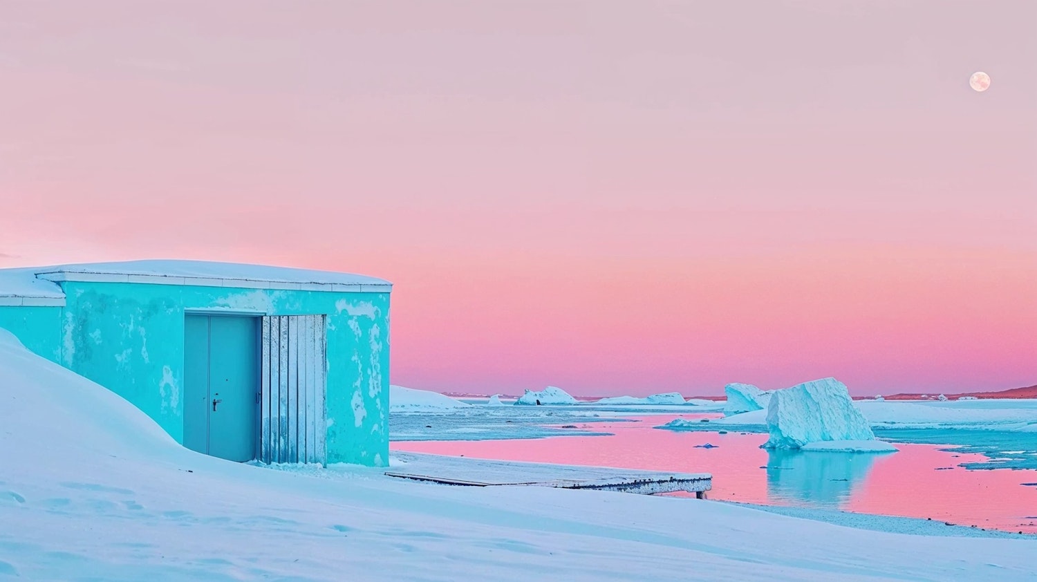 Pastel pink and blue icy landscape with a turquoise building, icebergs, and a full moon. Tranquil and ethereal scene.