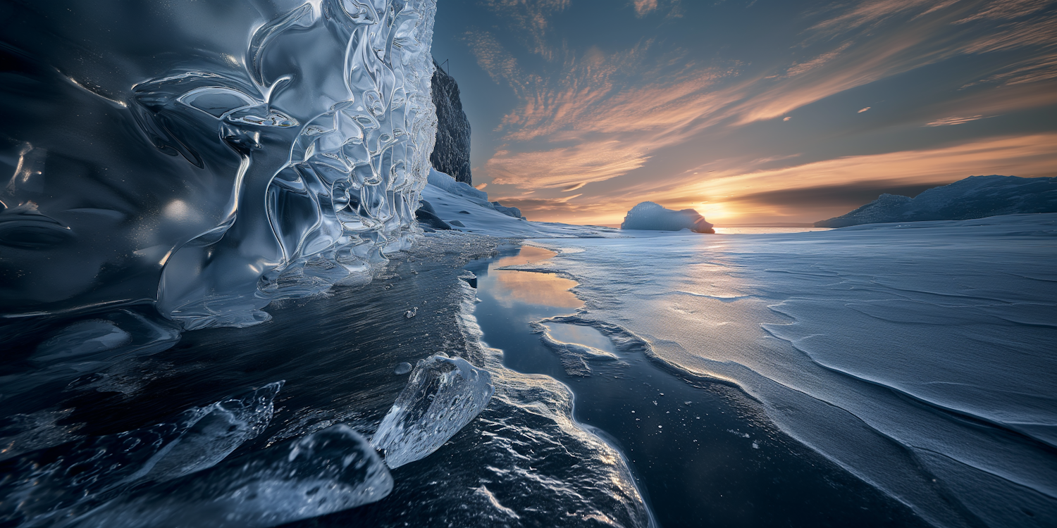 Stunning icy landscape at sunset with intricate ice formations and a serene sky reflecting warm hues.