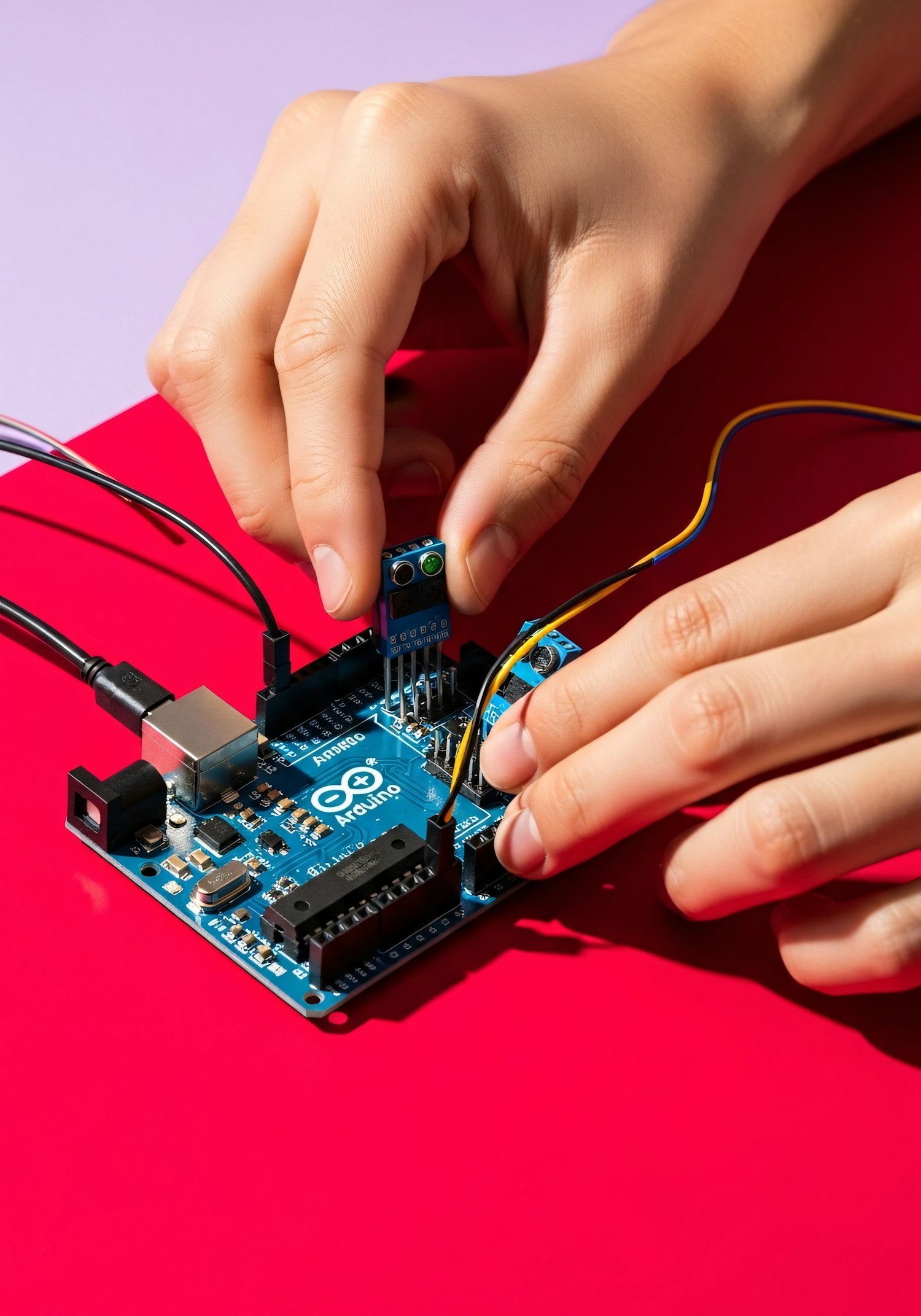 Hands assembling an Arduino microcontroller with wires on a vibrant red surface, showcasing creativity and precision in electronics.