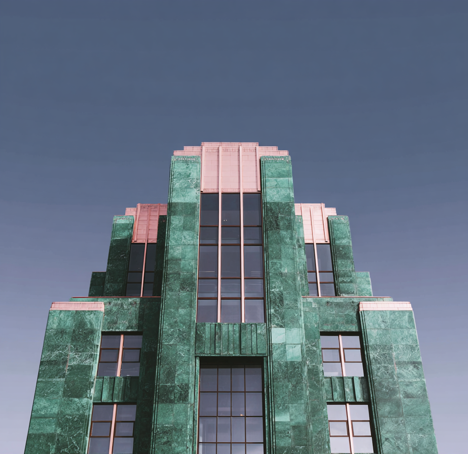 A stunning Art Deco building with green marble and pink accents against a clear blue sky, showcasing its symmetrical and tiered design.