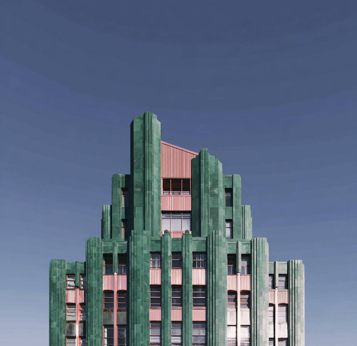 Art Deco building with green facade and pink accents against a clear blue sky, showcasing geometric patterns and vertical lines.