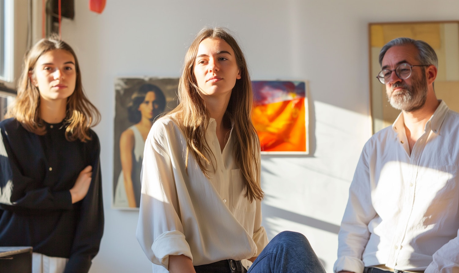 Three people in an art studio, with sunlight highlighting their thoughtful expressions and artistic surroundings.