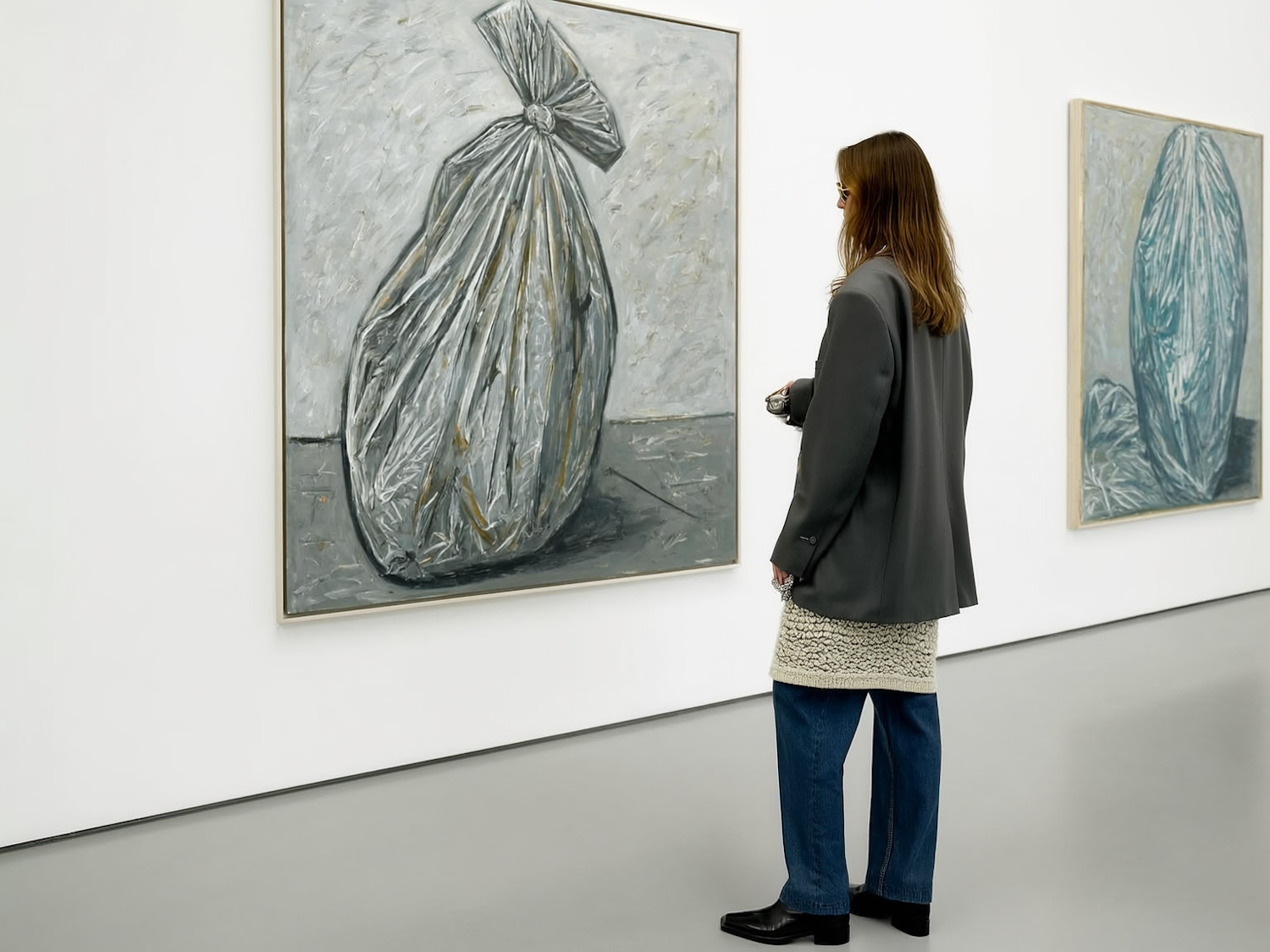 A person in a gallery observes abstract paintings of wrapped objects in muted tones, creating a minimalist and contemplative atmosphere.